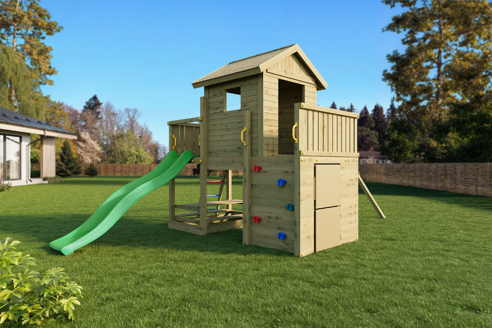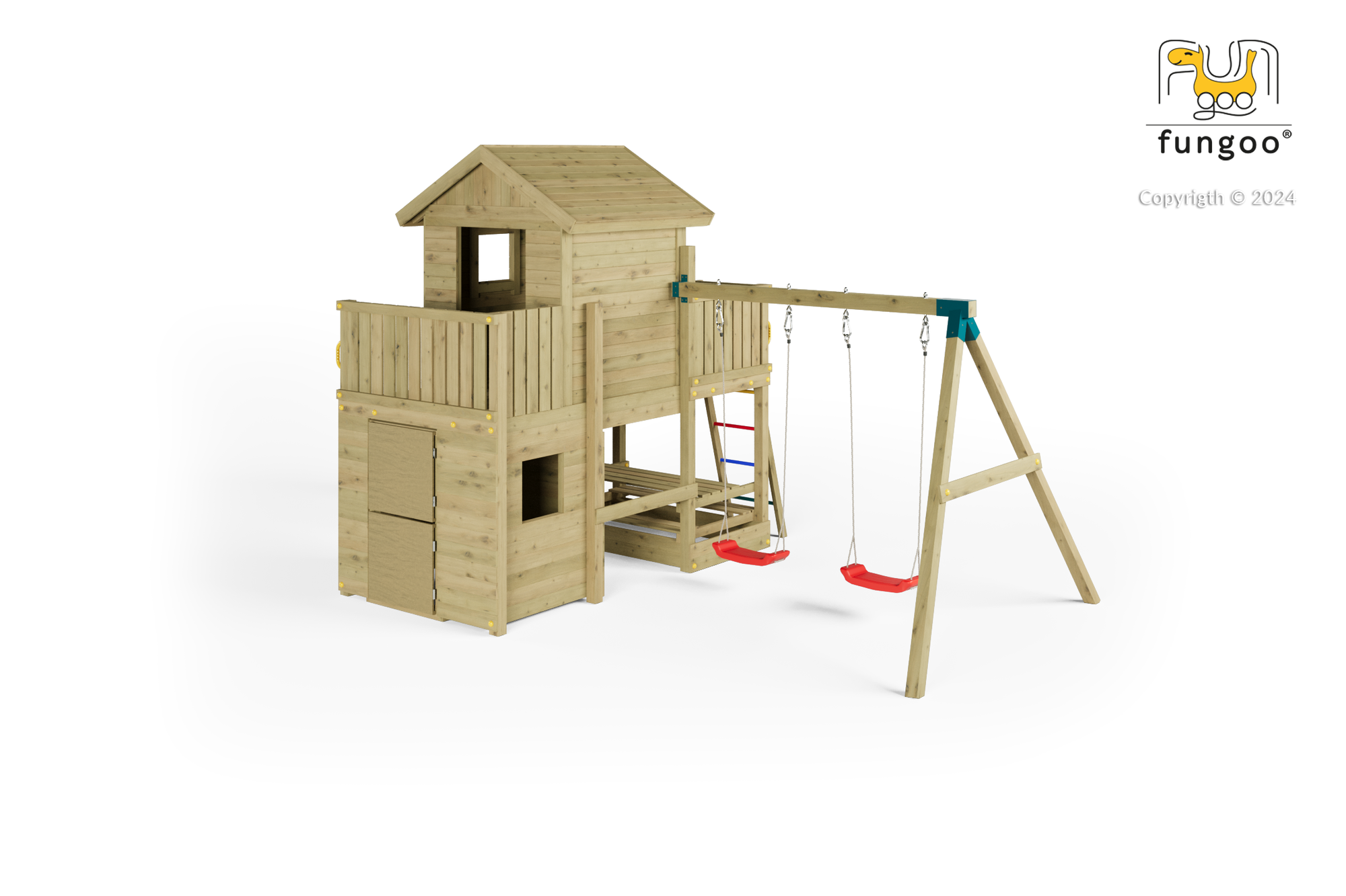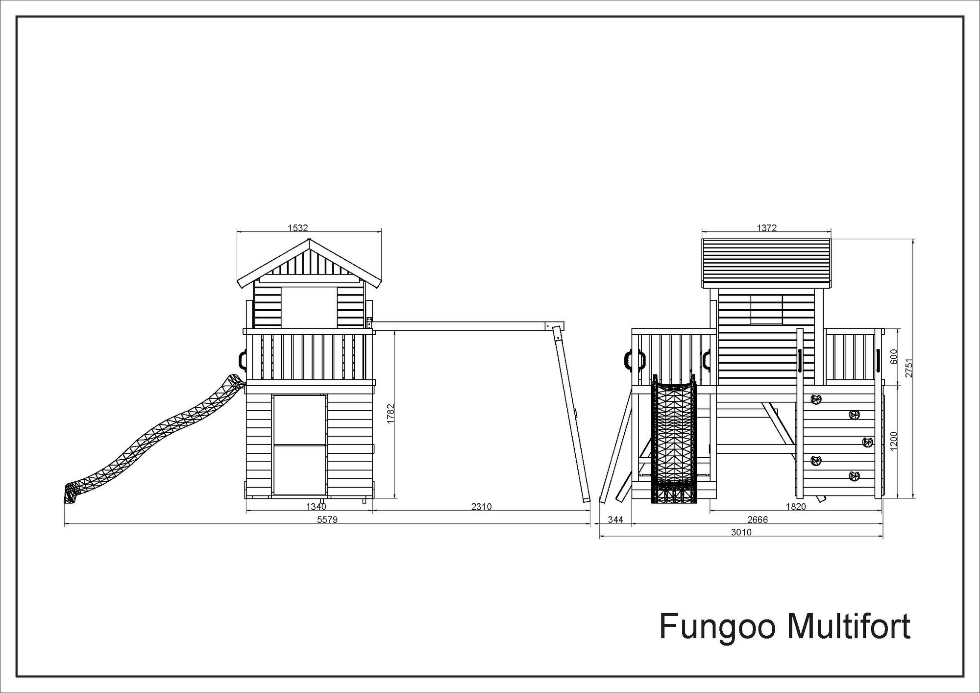 Plac zabaw Fungoo Multifort KDI składa się z następujących elementów, które zapewniają dzieciom wiele możliwości zabawy na świeżym powietrzu: