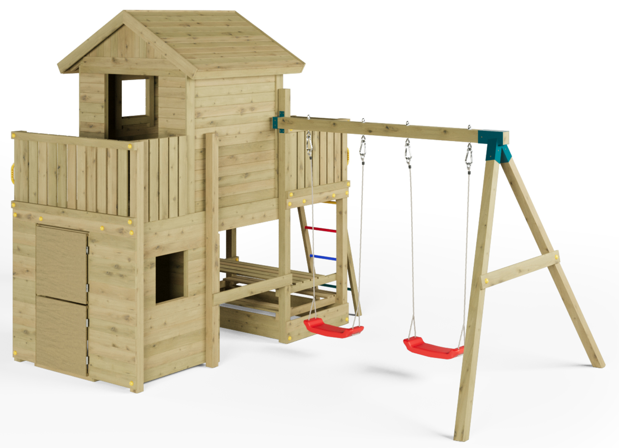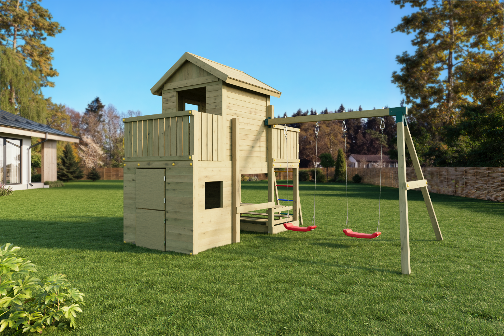 - Drewno, z którego wykonane są elementy jest trwałe i odporne na warunki atmosferyczne. Zestaw jest dostosowany do dzieci w różnym wieku.
