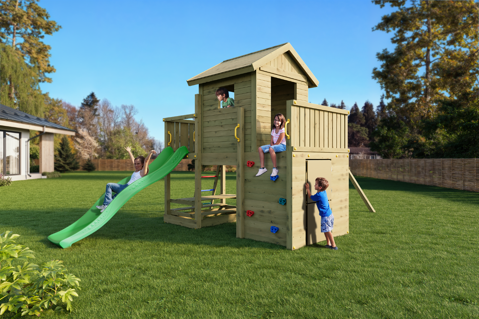 - Zjeżdżalnia (220 cm) – długa, zielona ślizgawka, która daje gwarancję emocjonujących zjazdów.