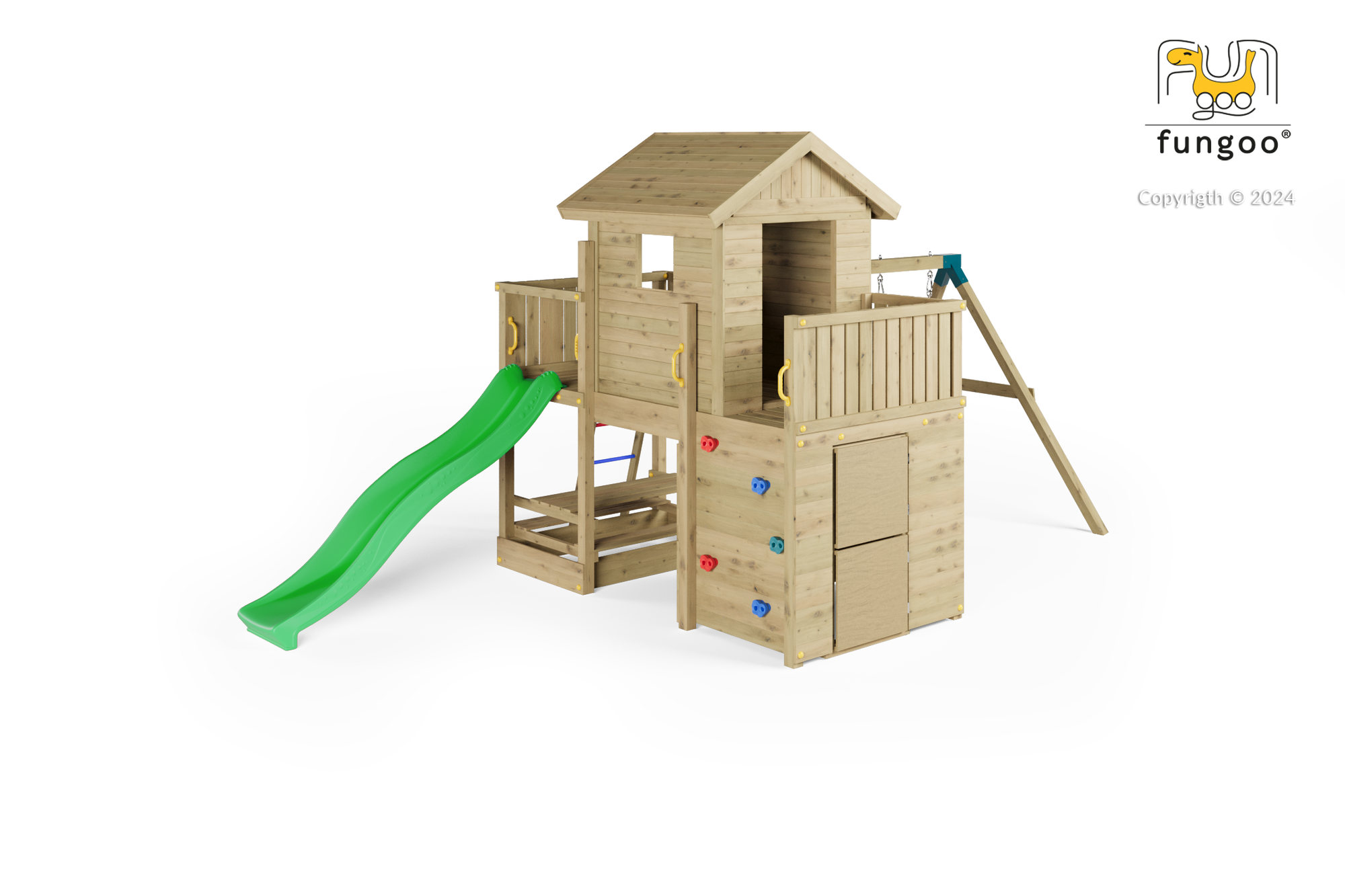 Fungoo Plac zabaw drewniany ogrodowy Multifort KDI, zjeżdżalnia, ścianka wspinaczkowa