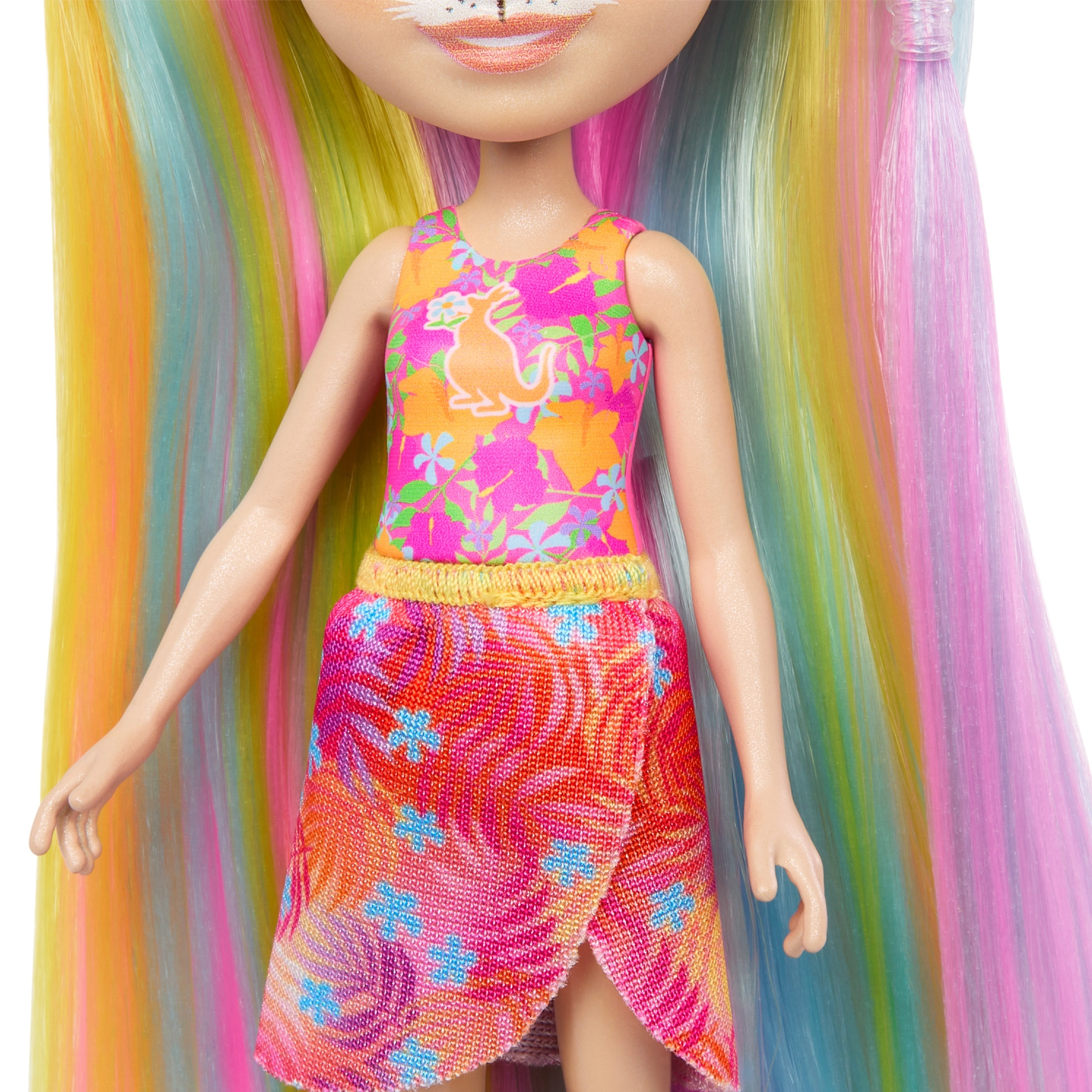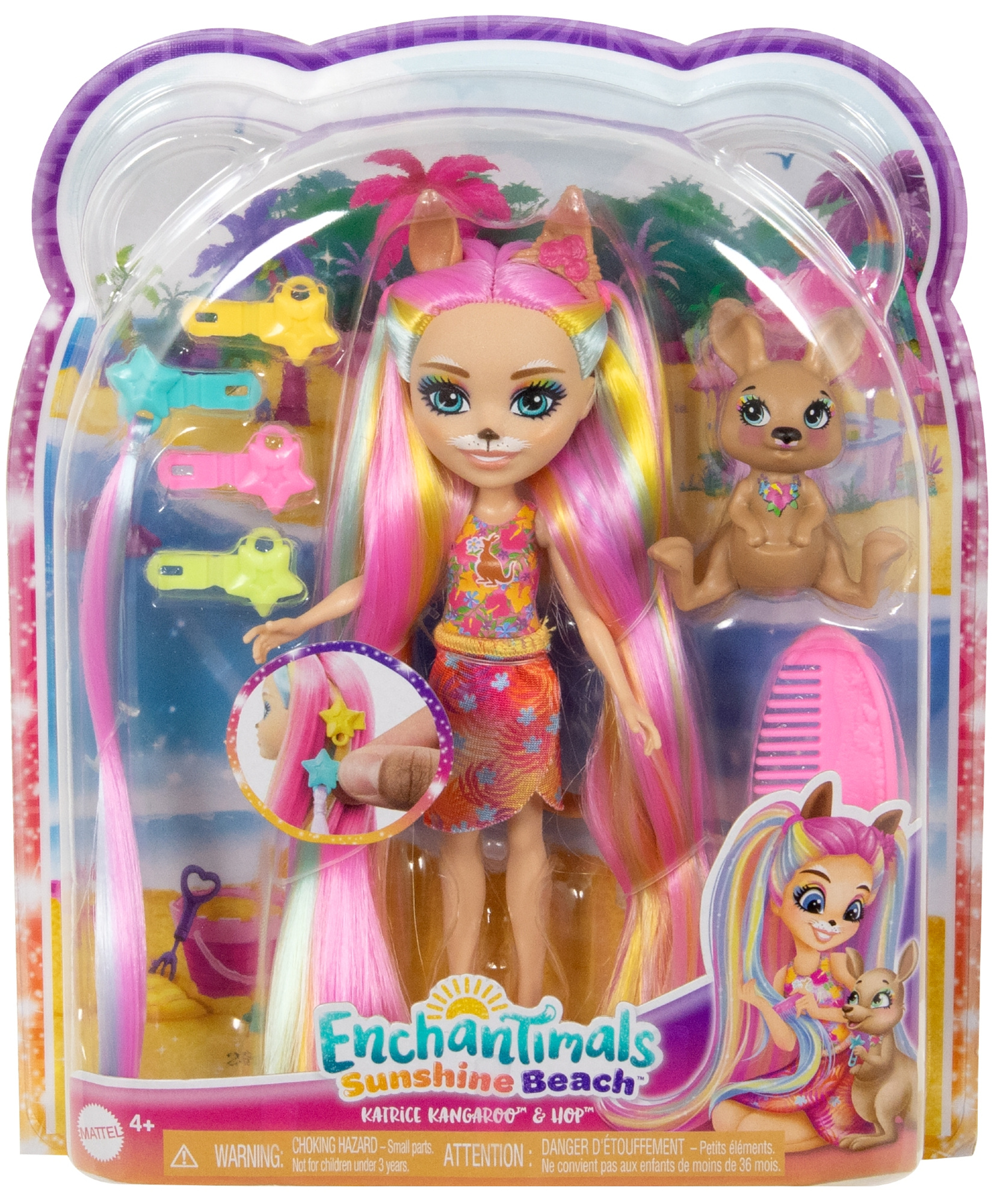 Katrice Kangaroo to lalka z serii Enchantimals, mierząca około 15 cm. Ma ultra-długie włosy, które dziecko może czesać i stylizować przy pomocy dołączonych akcesoriów.