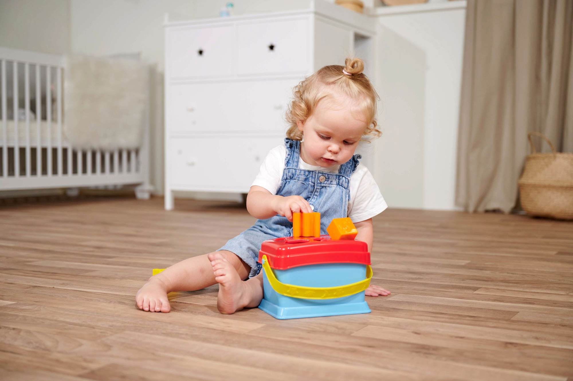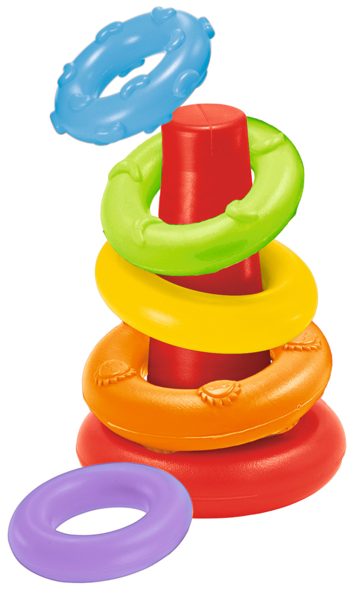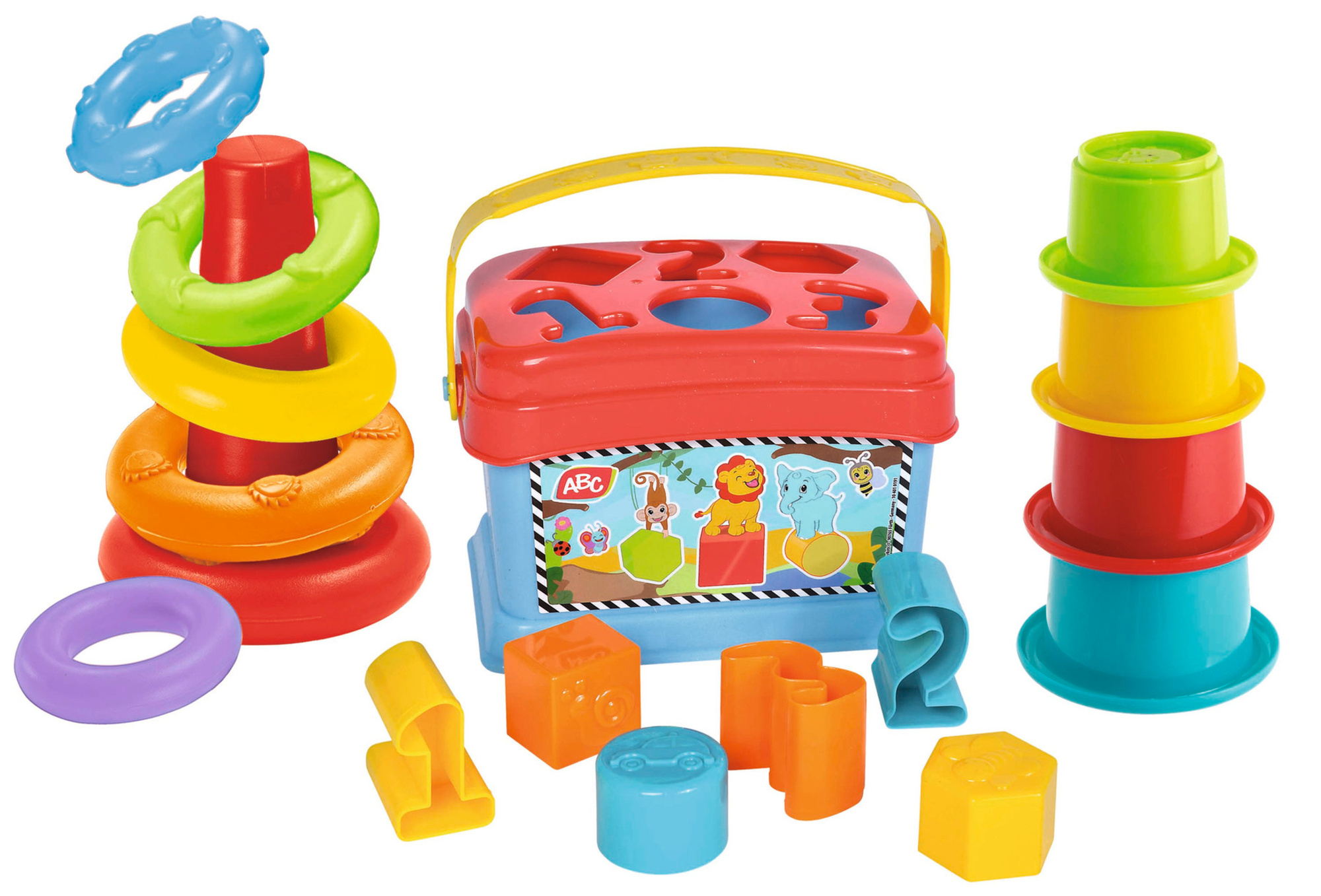 W zestawie znajdują się: Sorter kształtów, wieża z kubeczków do układania, piramidka z obręczami.