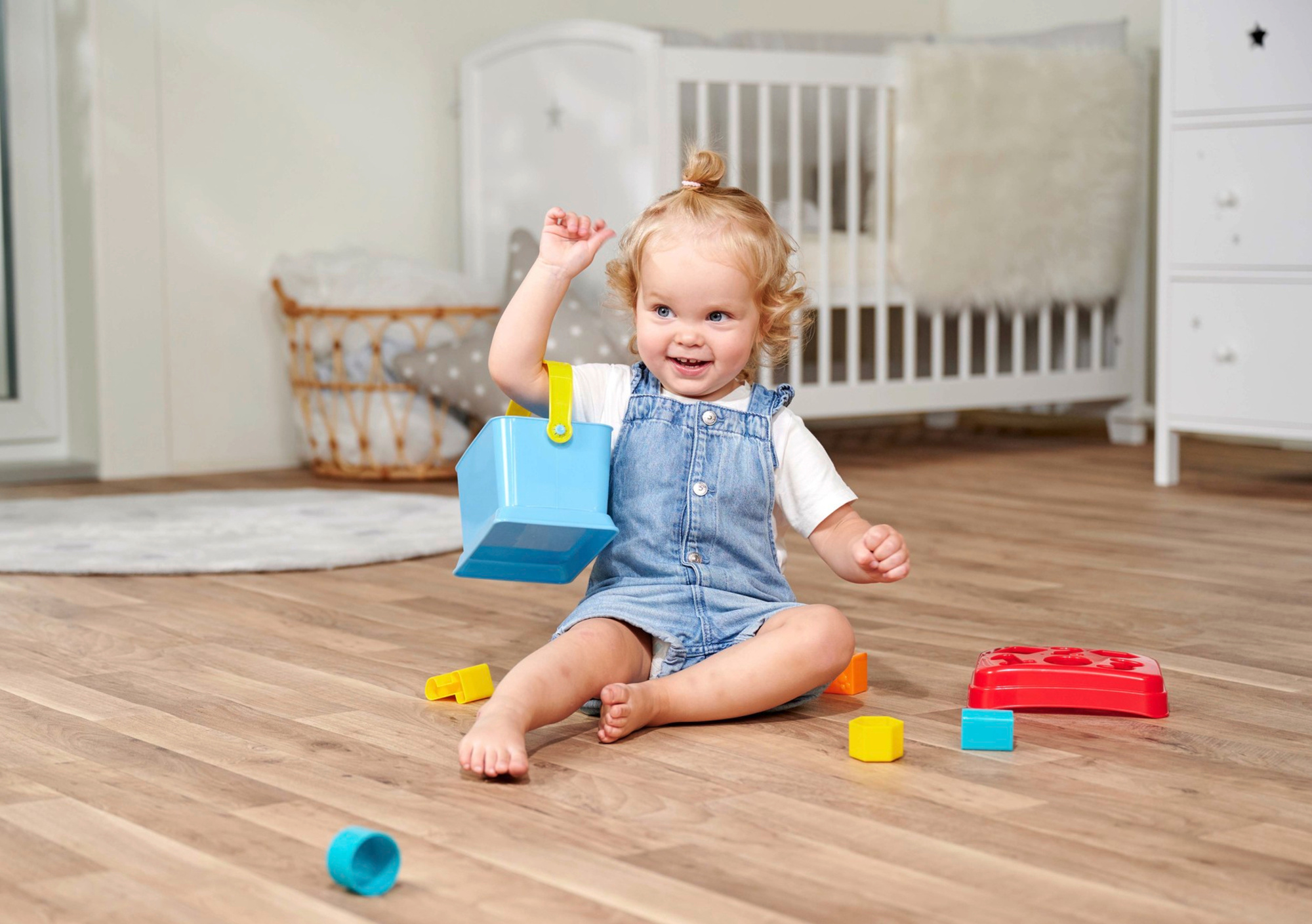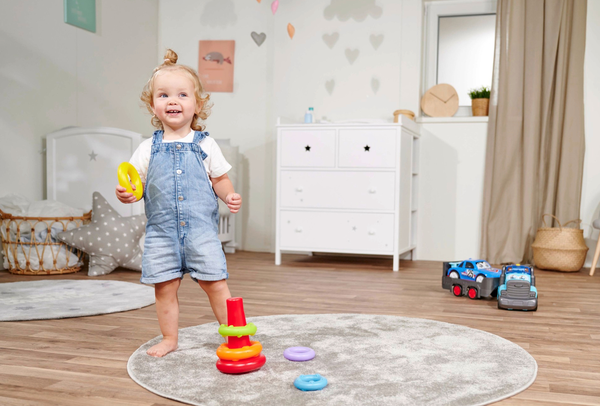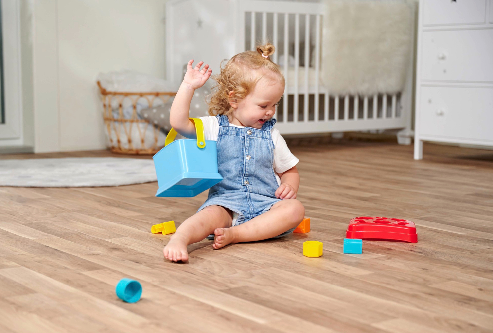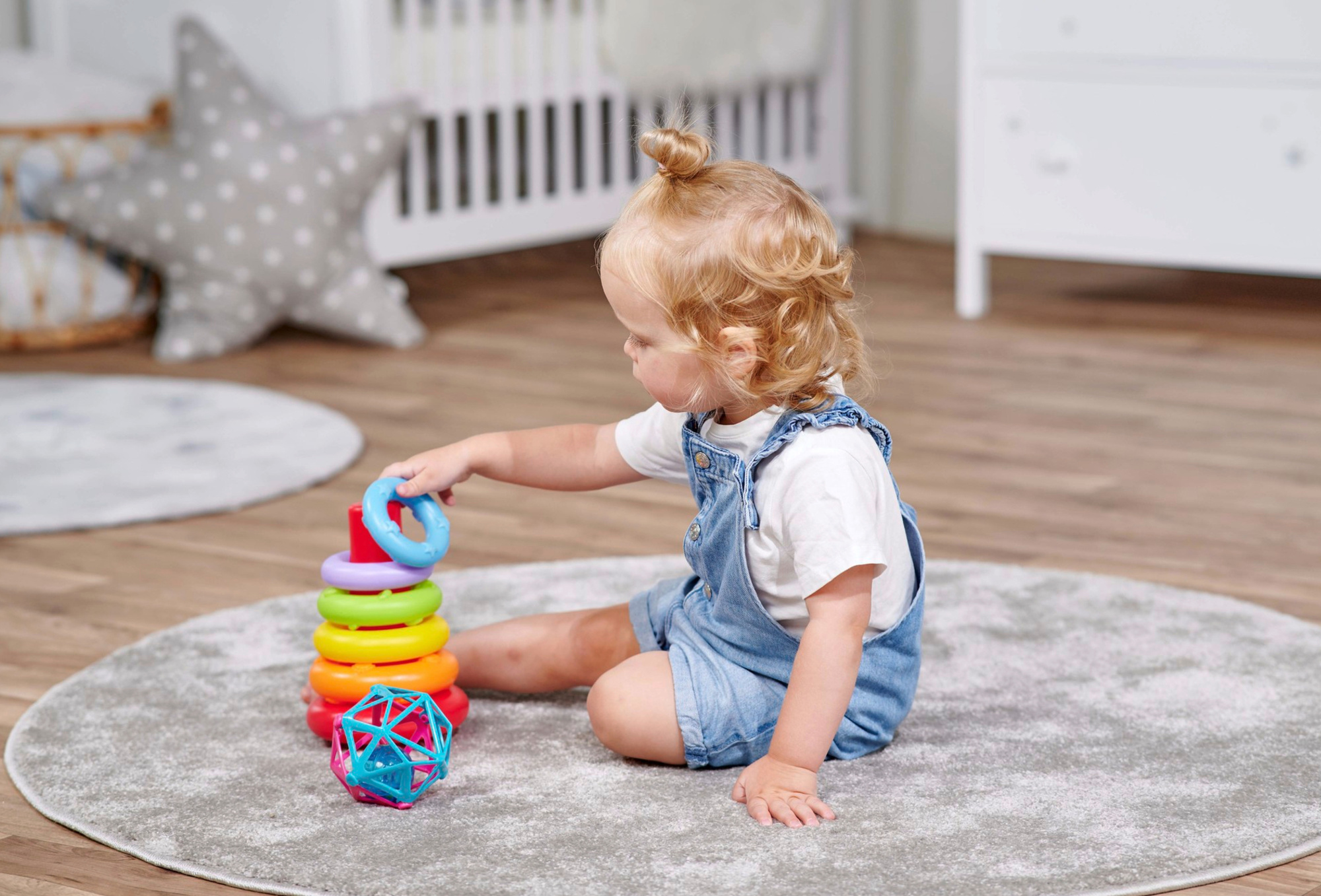 W zestawie znajdują się: Sorter kształtów, wieża z kubeczków do układania, piramidka z obręczami.