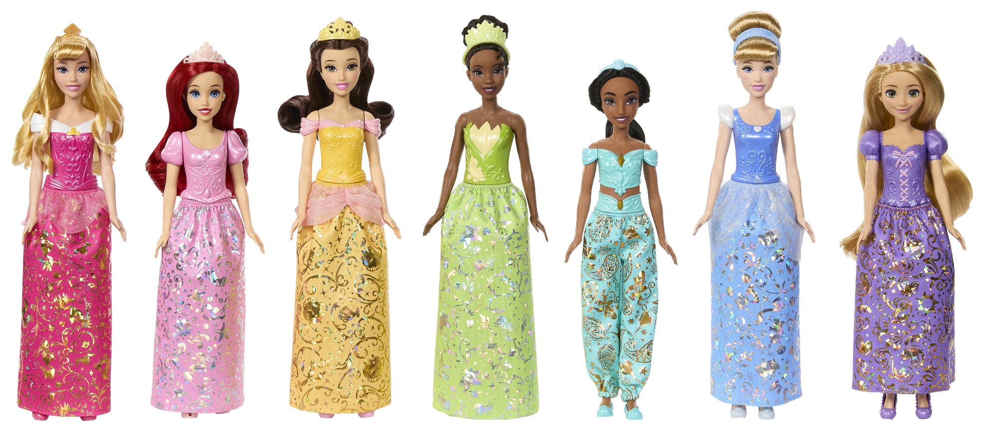 Zestaw Lalki Disney Księżniczki 7 bohaterek w błyszczących strojach Arielka Roszpunka Aurora Kopciuszek Bella Jasmina Tiana