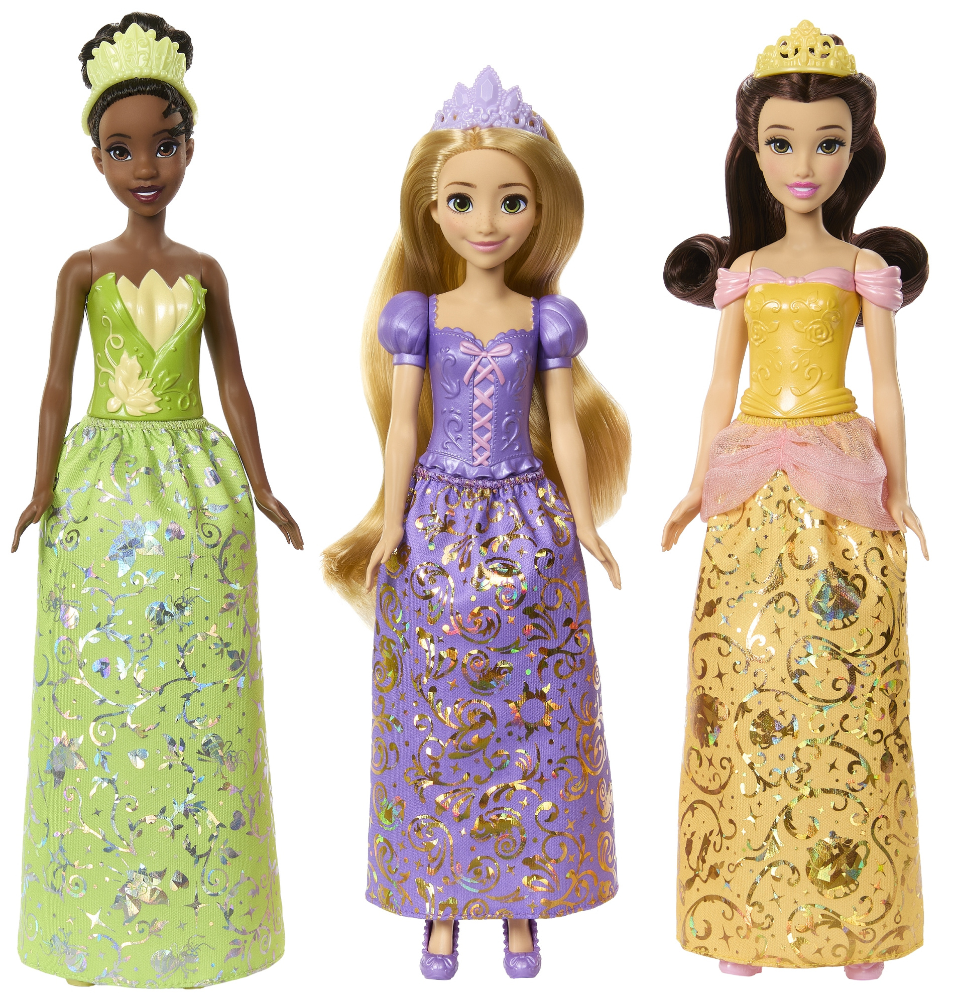 - Każda lalka ma błyszczącą, zdejmowaną spódniczkę, koronę lub opaskę oraz miękkie, stylizowane włosy, które można czesać.