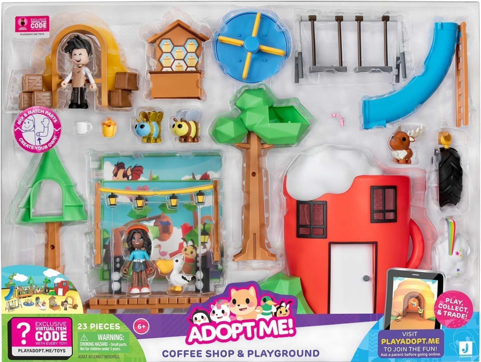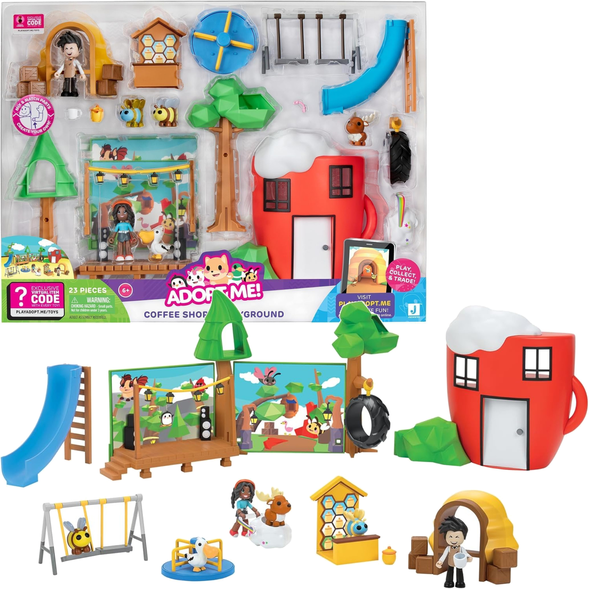 - Przenieś ulubioną wirtualną grę do realnego świata dzięki zestawowi Adopt Me! „Kawiarnia i Plac Zabaw”. Ten 23‑elementowy zestaw łączy w sobie scenografię dwóch kultowych lokacji – przytulnej kawiarni oraz kolorowego placu zabaw – i pozwala dzieciom tworz