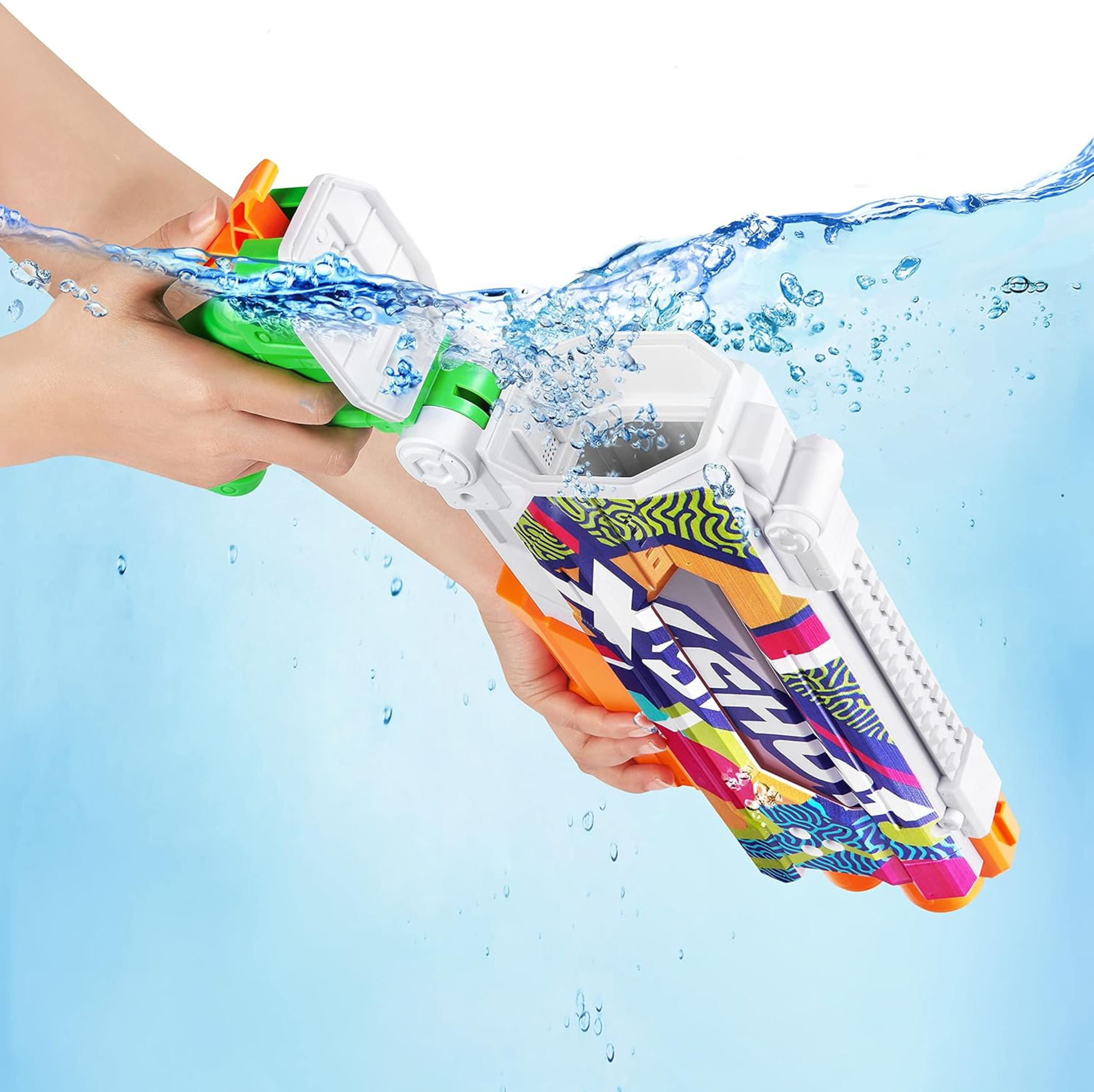 Wbudowany mechanizm Fast-Fill umożliwia napełnienie zbiornika w zaledwie 1 sekundę, co pozwala natychmiast wrócić do akcji bez zbędnych przerw. Pistolet wystrzeliwuje wodę na odległość aż 10 metrów, zapewniając mocny i precyzyjny strzał. Dzięki długości 49 cm, model ten łączy w sobie imponujący zasięg i dużą pojemność, oferując jednocześnie wygodny i pewny chwyt.
