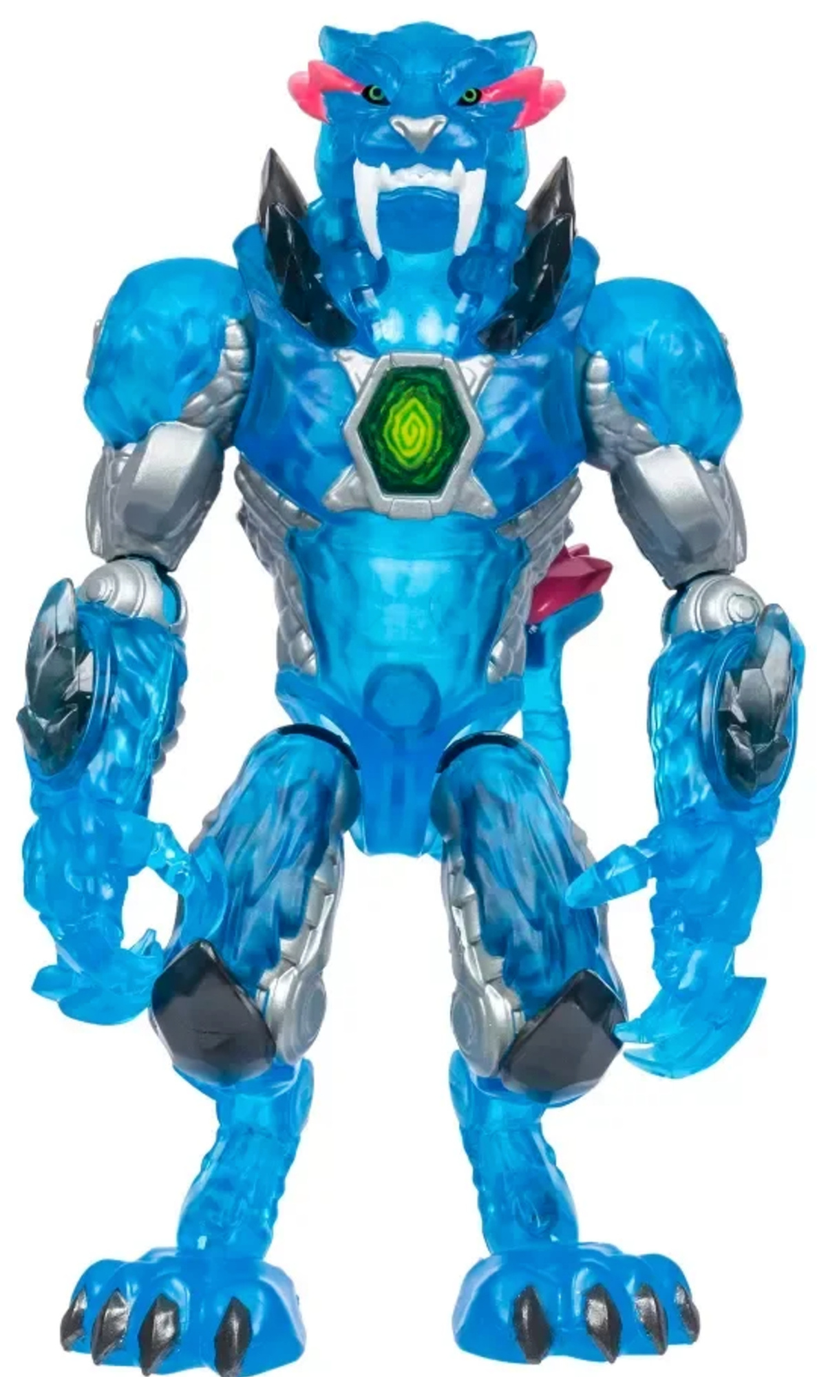 Figurka Pantery z serii MrBeast Lab Mutators prezentuje się niczym futurystyczny drapieżnik z mechanicznego świata: całe jej ciało pokrywa lśniąca, metaliczna powłoka w odcieniach stalowego srebra. Postać wygląda groźnie.