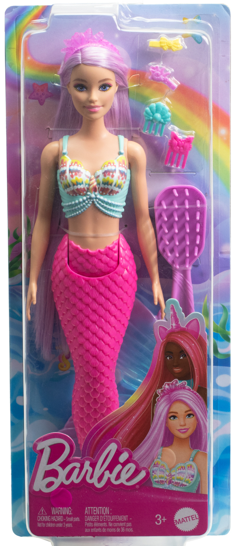 - Barbie ma jasną skórę, niebieskie oczy i długie fioletowo-różowe włosy. Syrenka posiada różowy ogon z uroczymi detalami. Ubrana jest w turkusowy top z detalami, inspirowany muszelkami i koralami (topu nie można zdjąć), a na głowie nosi różową tiarę, która