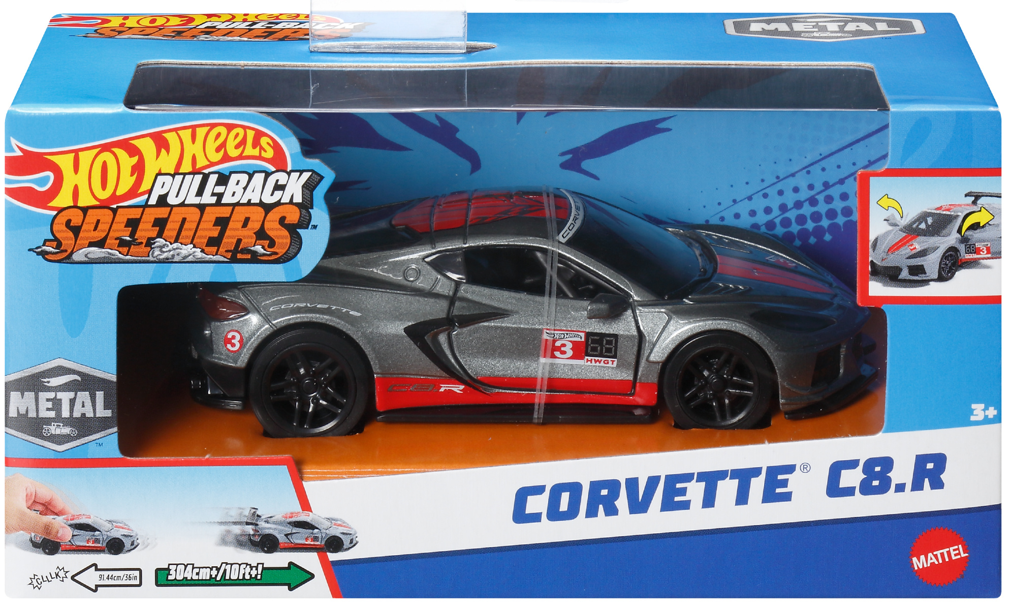 - Przygotuj się na ekscytującą jazdę z modelem Hot Wheels Corvette C8.R Pull-Back Speeders w skali 1:43! Ten wyjątkowy pojazd wyróżnia się większym rozmiarem niż standardowe resoraki oraz dynamicznym napędem pull-back – wystarczy go cofnąć i puścić, by rusz