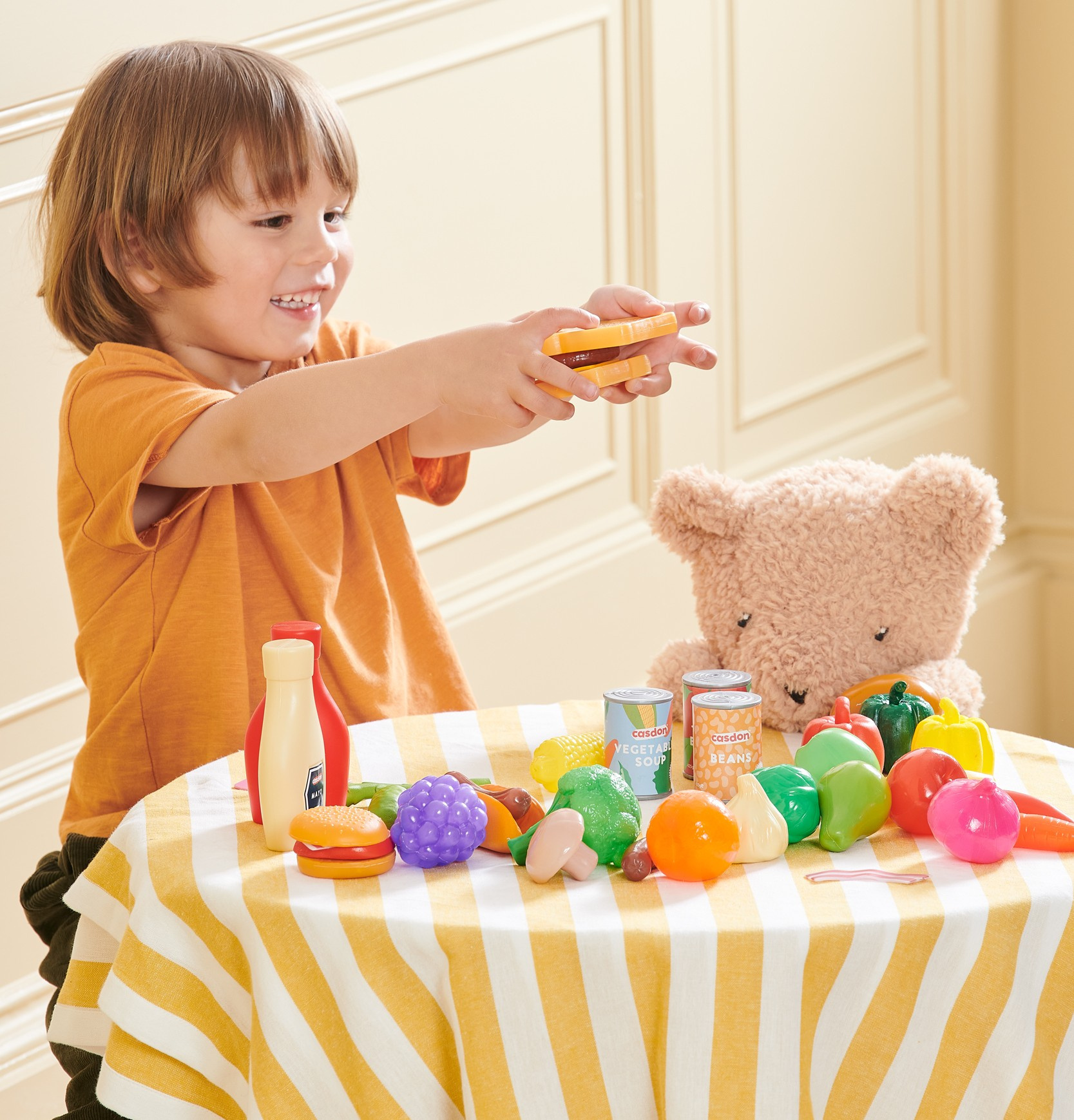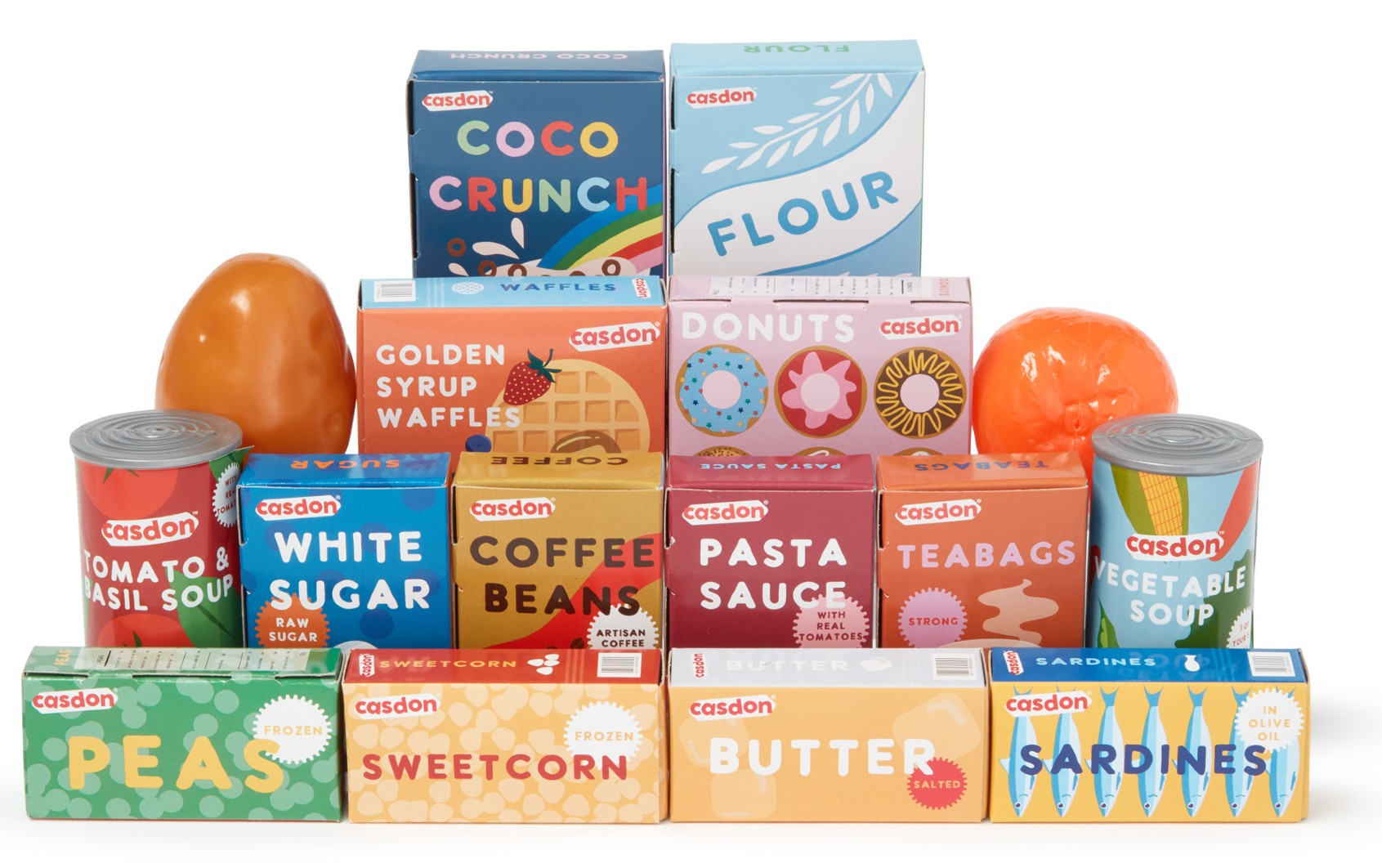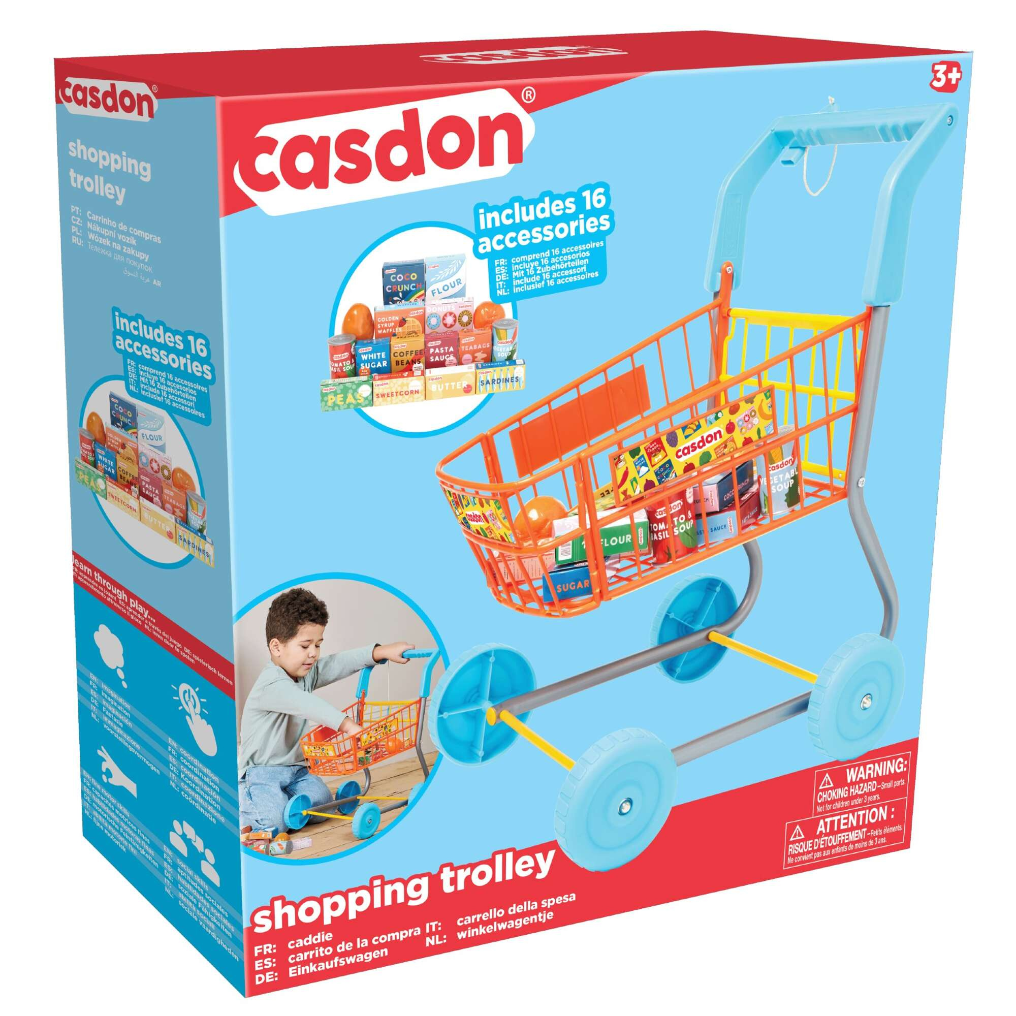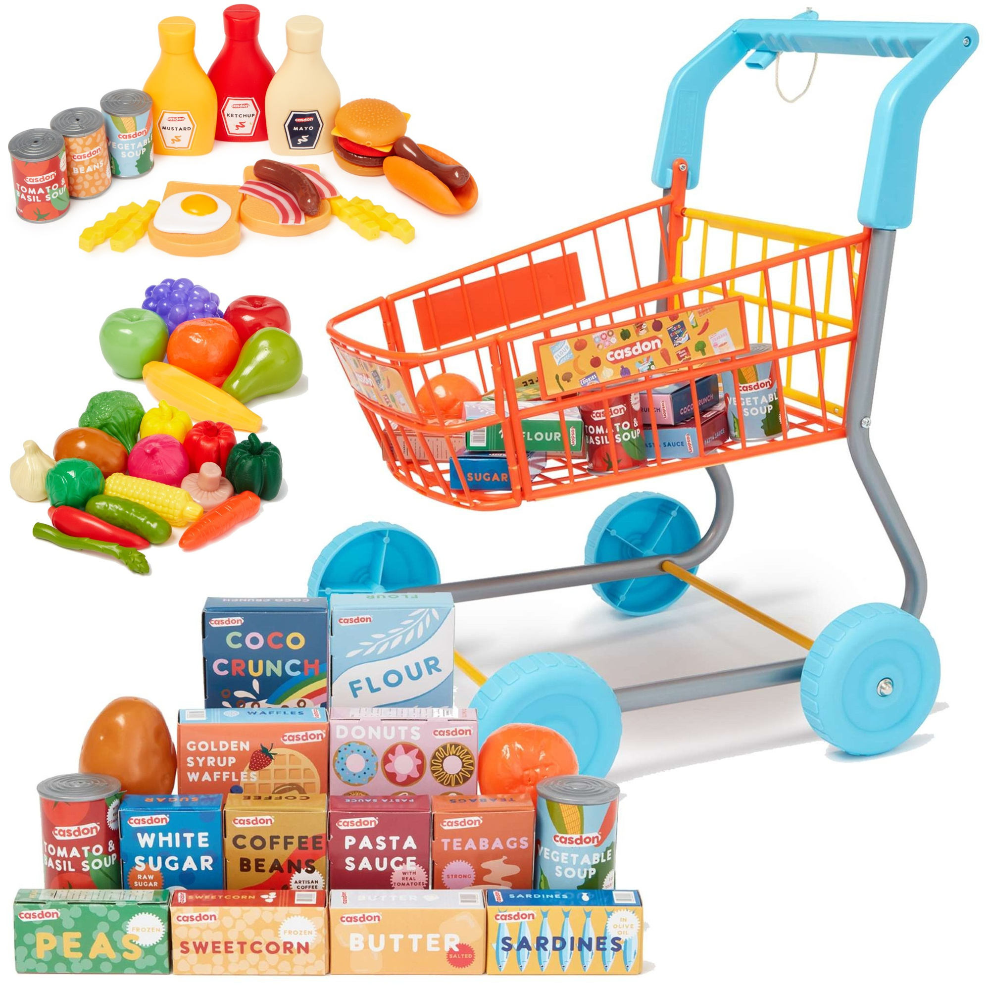 Zestaw zabawek Casdon to idealna propozycja dla małych miłośników zabawy w sklep i zakupy! Zawiera dwa fantastyczne produkty: kolorowy wózek sklepowy z 16 imitacjami artykułów spożywczych, takich jak pomarańcze, mąka, herbata czy kawa, oraz zestaw "Małe zakupy spożywcze", który składa się z 44 elementów – owoców, warzyw oraz innych produktów, takich jak puszki, frytki czy ketchup.