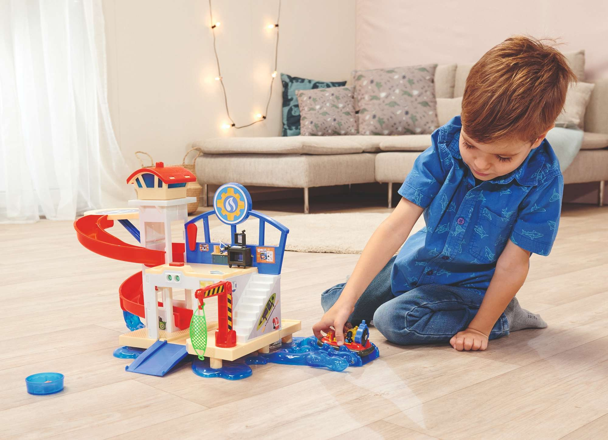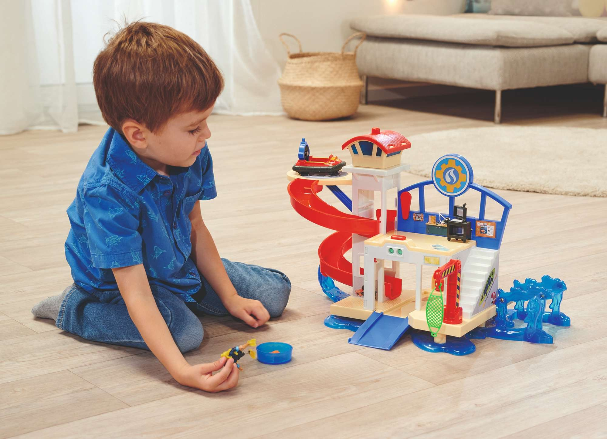 - Stacja oceaniczna ma dwa poziomy do zabawy, ruchome elementy, w tym otwierane drzwi, imitacje fali morskich.