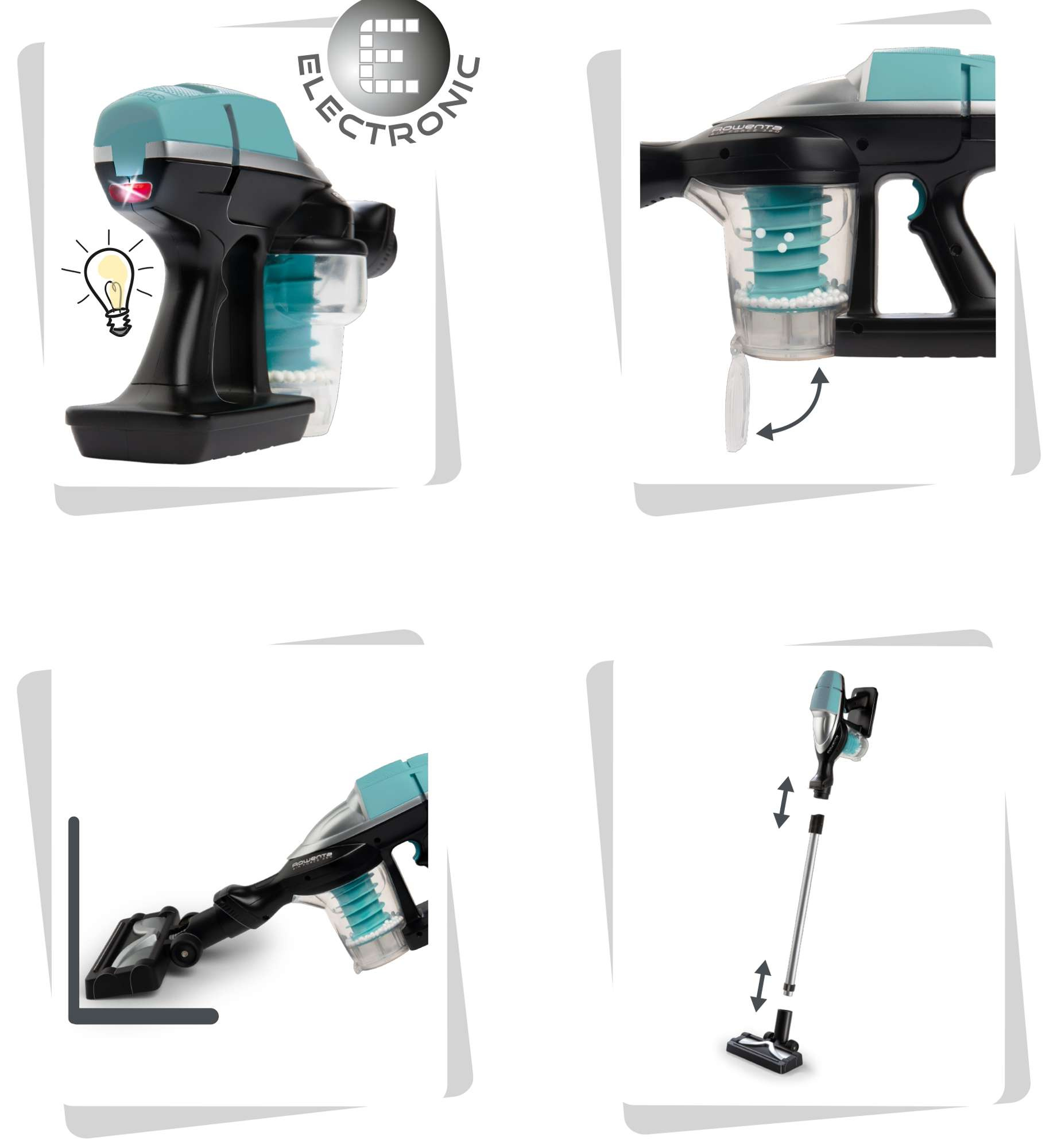 Do wyboru są trzy wersje, odkurzacz może być używany jako odkurzacz podłogowy, odkurzacz ręczny lub odkurzacz ręczny z dyszą podłogową. Zabawka posiada wygodny uchwyt co sprawia, że zabawa odkurzaczem jest komfortowa dla dzieci.