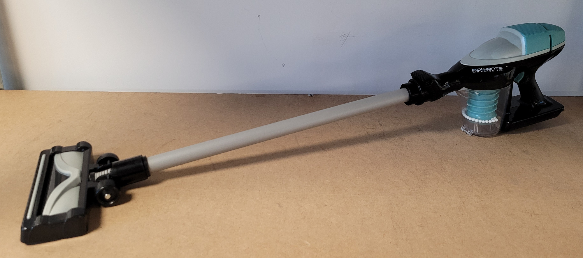 Odkurzacz Rowenta wykonany z materiałów wysokiej jakości i jest w kolorze szaro-miętowym z czarnymi elementami. Odkurzacz posiada przezroczysty zbiorniczek, do którego wpada dołączony do zestawu specjalny granulat. Zbiorniczek następnie można otworzyć i opróżnić, aby dziecko mogło ponownie bawić się w odkurzanie.