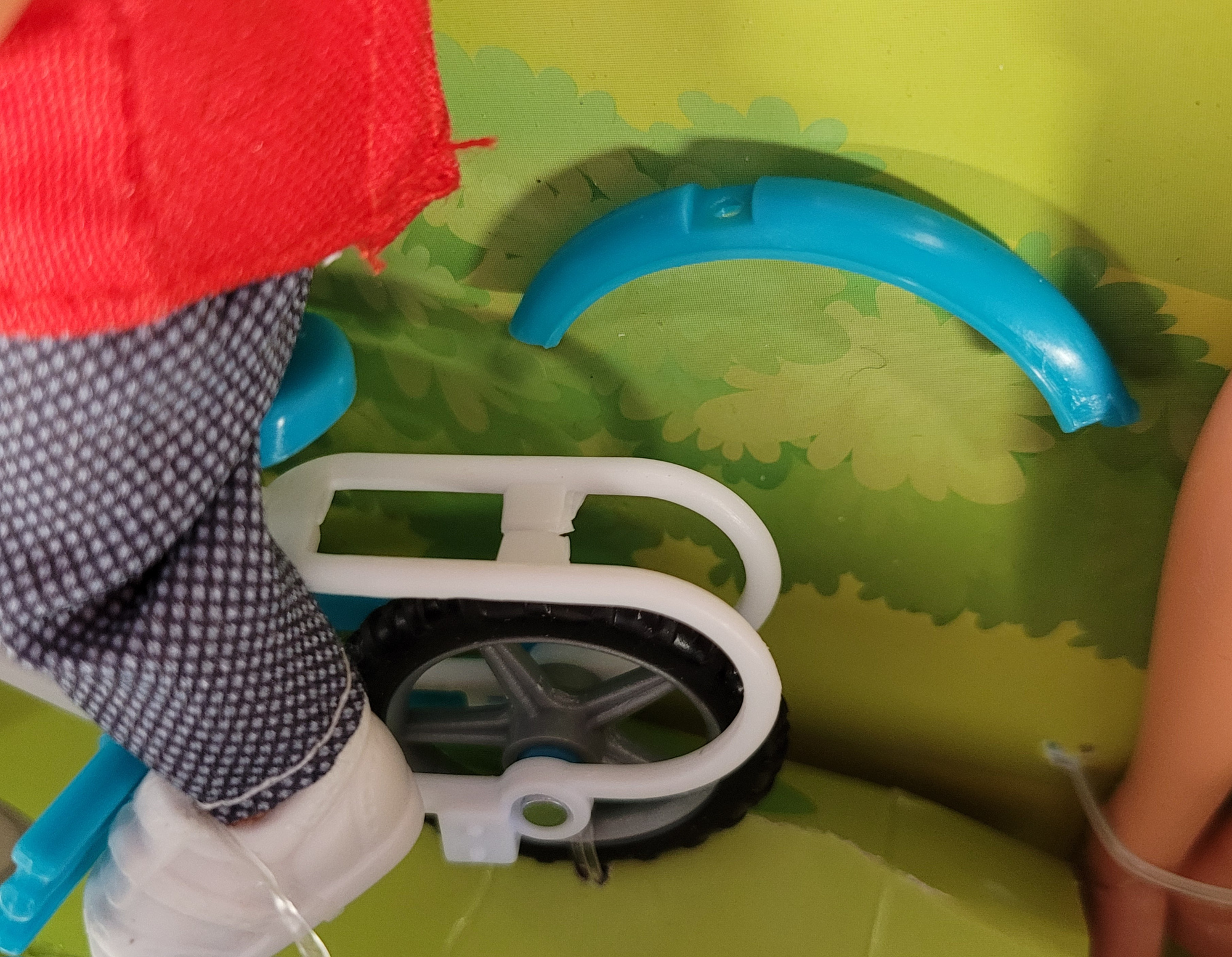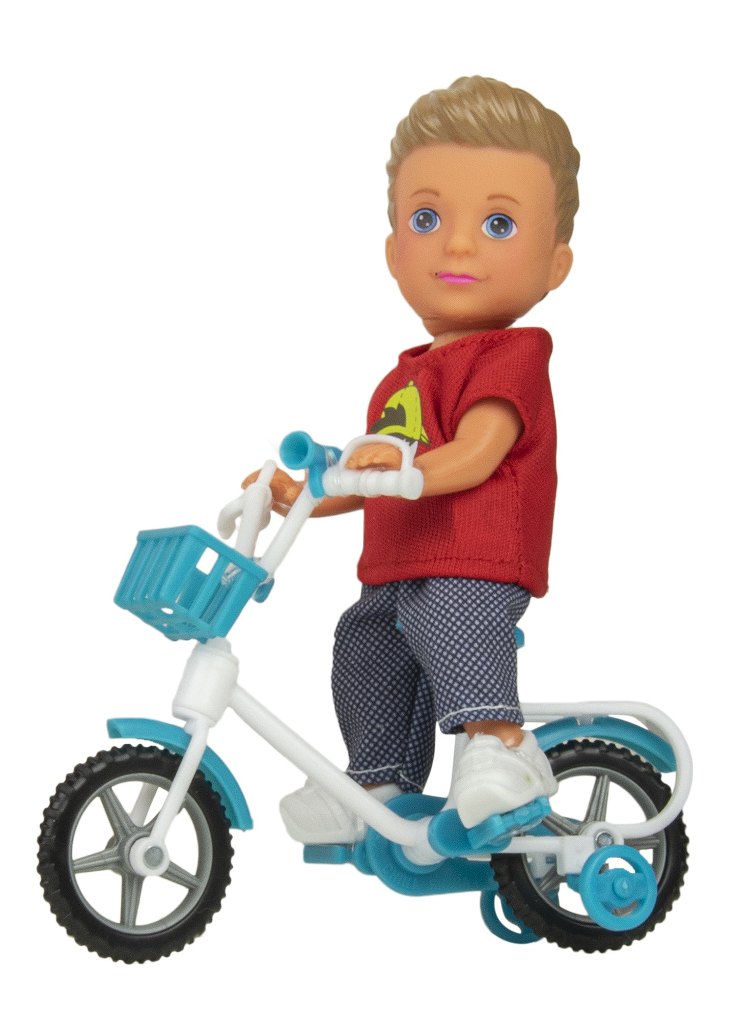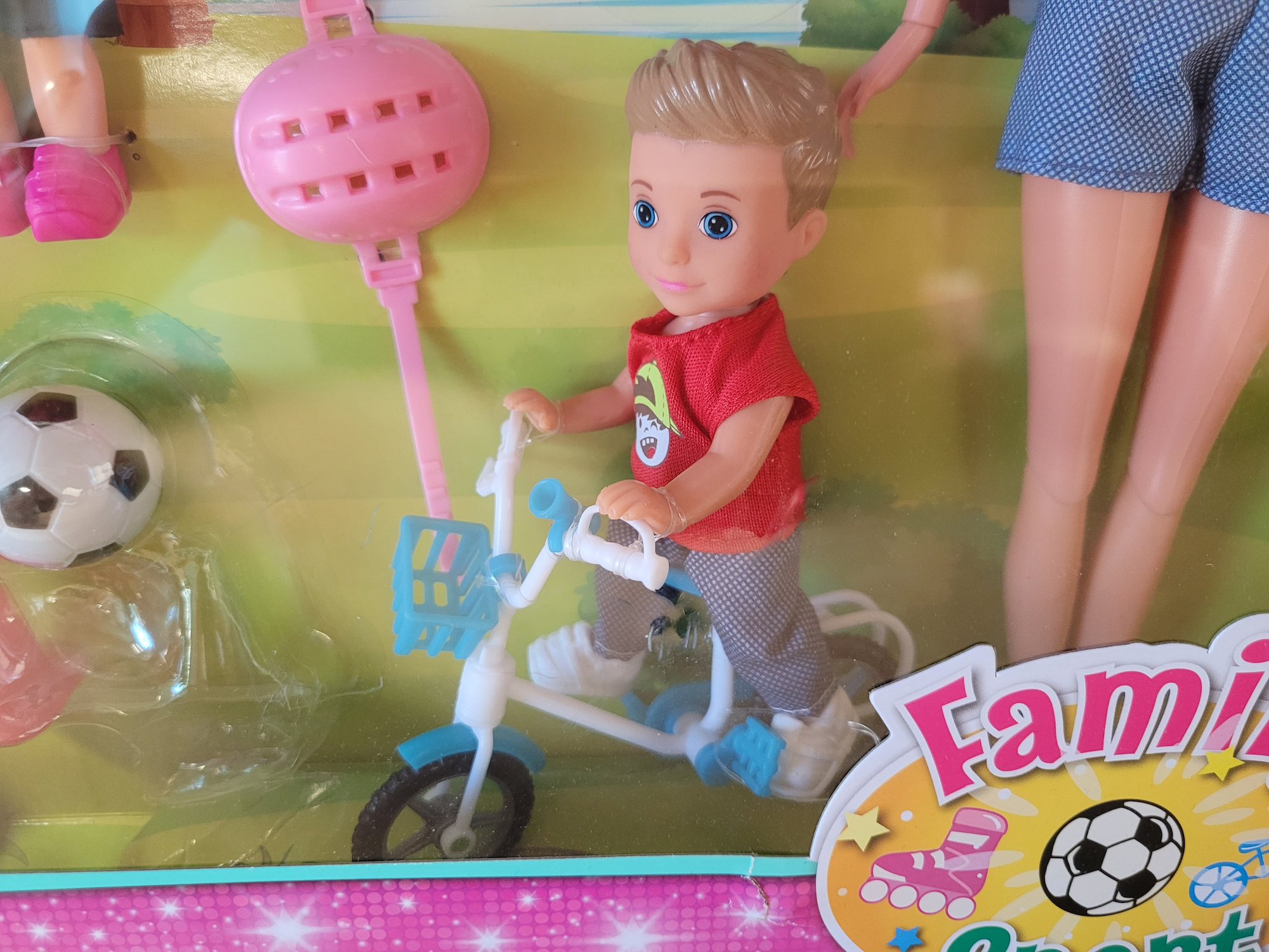 Córeczka także ma długie blond włosy i niebieskie oczy, jest ubrana w czarne szorty, różową sportową koszulkę i buciki. Dodatkowo ma piłkę i znak do gry. Synek ma jasnobrązowe włosy i niebieskie oczy, jest ubrany w czerwony T-shirt, granatowe spodni w kratkę i białe sportowe buciki. Jeździ na biało-niebieskim rowerze, który został wyposażony stopkę, koszyczek i bagażnik.