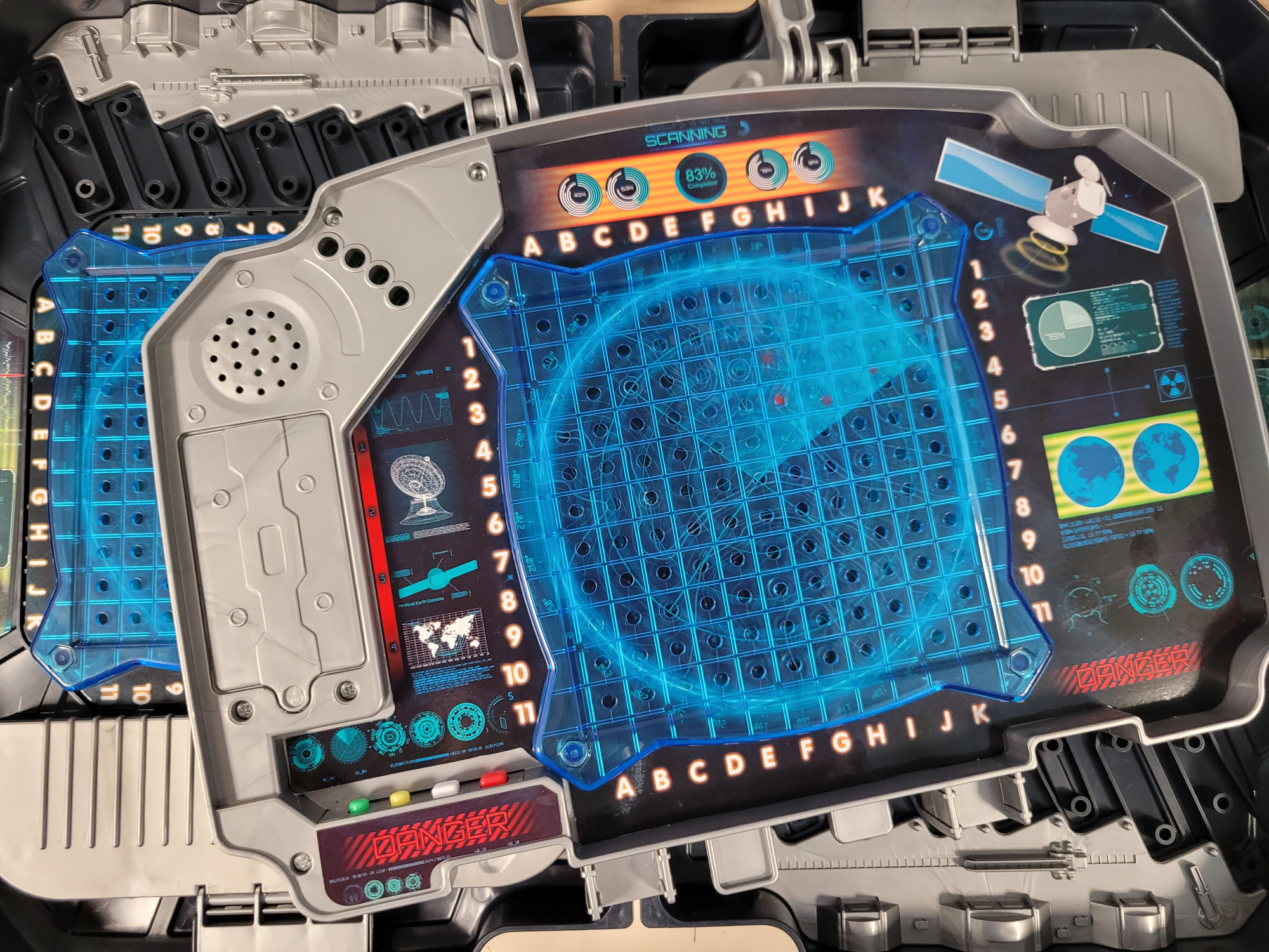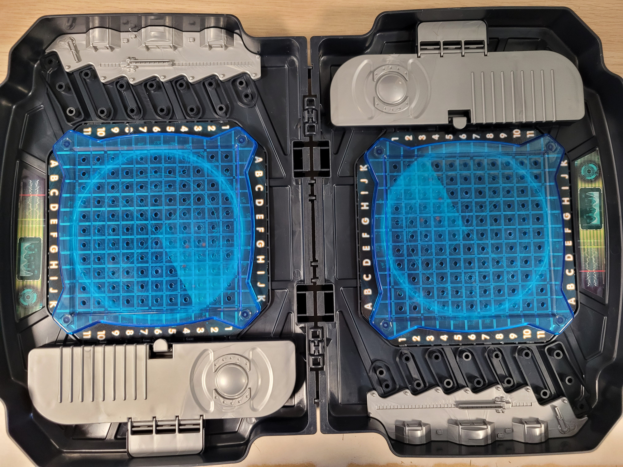 Gra zamknięta jest w grafitowej, plastikowej walizce z zamkiem do jej zamykania i rączką do przenoszenia. Po otwarciu walizki, w środku po obu stronach walizki znajdują się dwie plastikowe, niebieskie plansze do umieszczania w nich statków oraz dwa szare, otwierane schowki na pionki. W walizce znajduje się tak że środkowa część z rączką. Środkowa część także posiada dwie niebieskie plansze po obu stronach, z tym, że na tych planszach oznacza się pola przeciwnika. Środkowa część zestawu została wyposażona w efekty świetlne i dźwiękowe, którymi gracze mogą zasygnalizować trafienie lub chybienie statu przeciwnika. Trafienie statku przeciwnika sygnalizuje czerwony przycisk, który uruchamia diody świecące czerwonym światłem oraz dźwięk pocisku trafiającego statek. Chybienie statku przeciwnika sygnalizuje zaś biały przycisk, który także uruchamia czerwone diody, ale efekt dźwiękowy imituje pocisk trafiający w wodę.