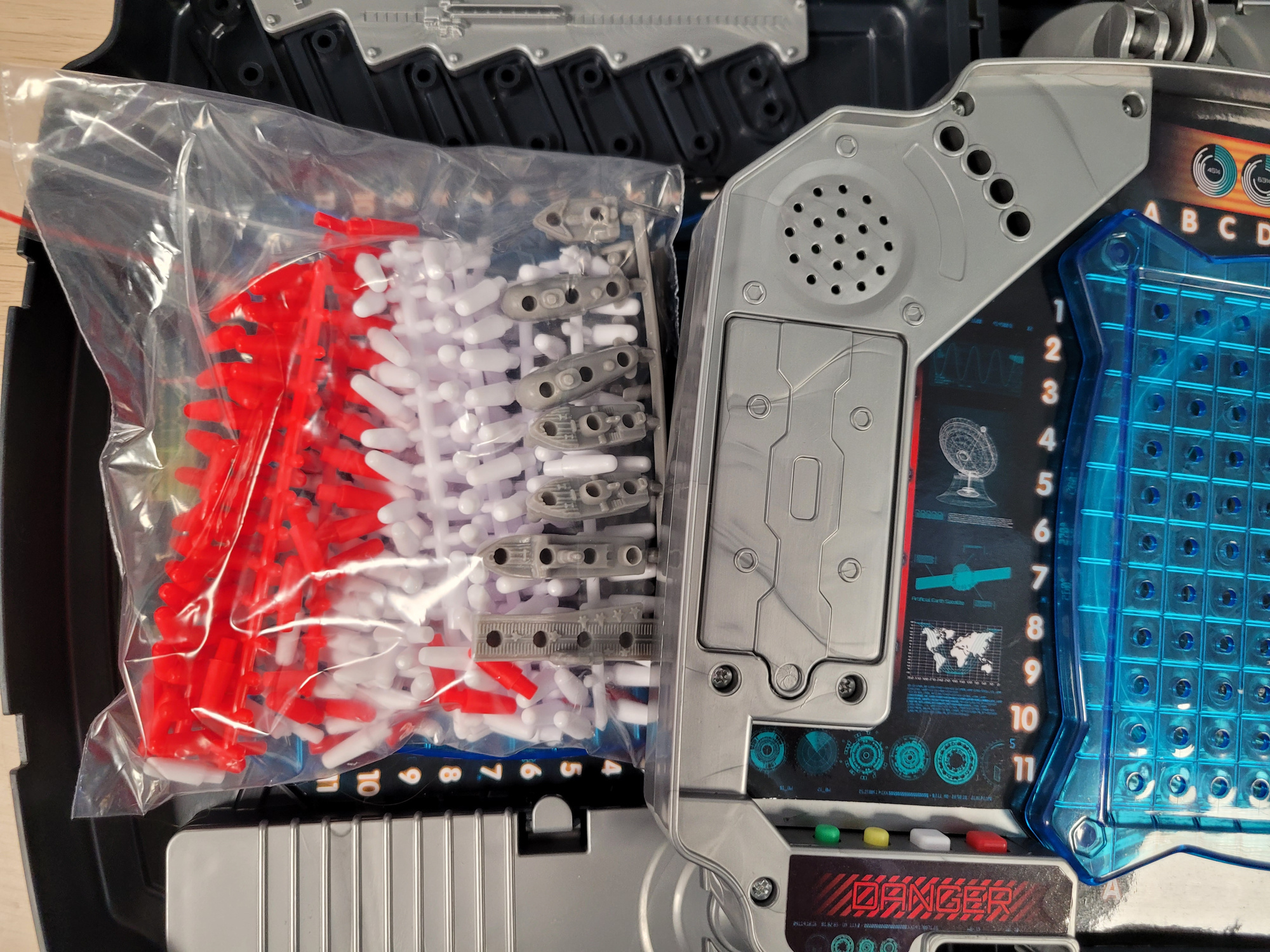 W zestawie znajduje się 14 szarych statków oraz czerwone i białe pionki-pociski do oznaczania trafień i chybień. W zestawie jest także instrukcja w języku polskim.