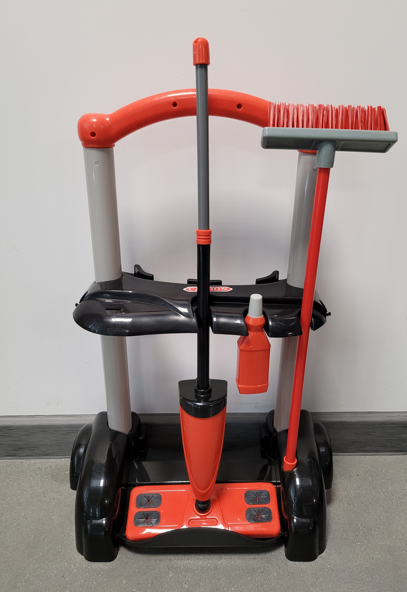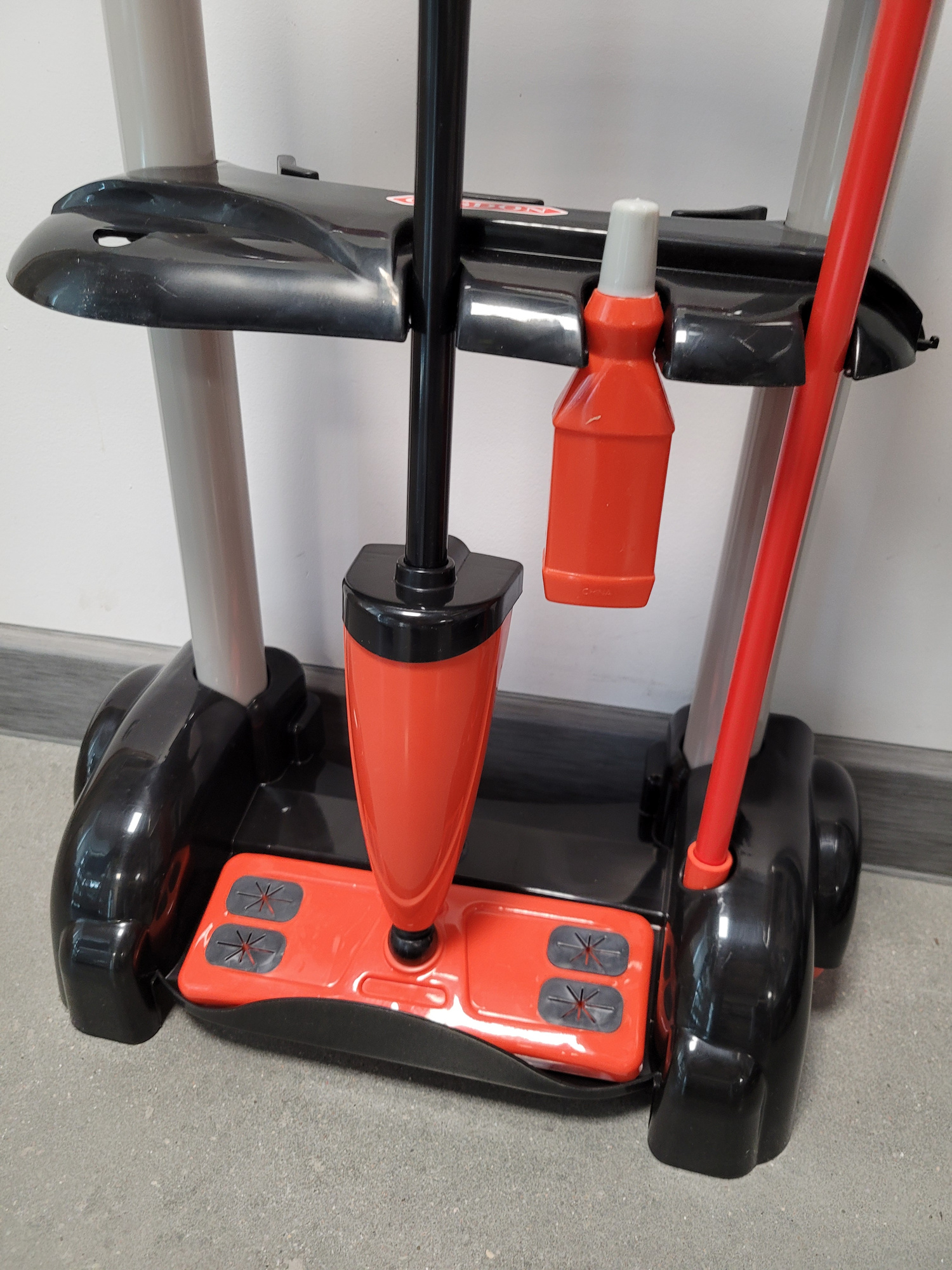- w skład zestawu wchodzi: wózek, mop ze zdejmowaną szmatką, miotła, płyn do sprzątania (imitacja), worek na śmieci