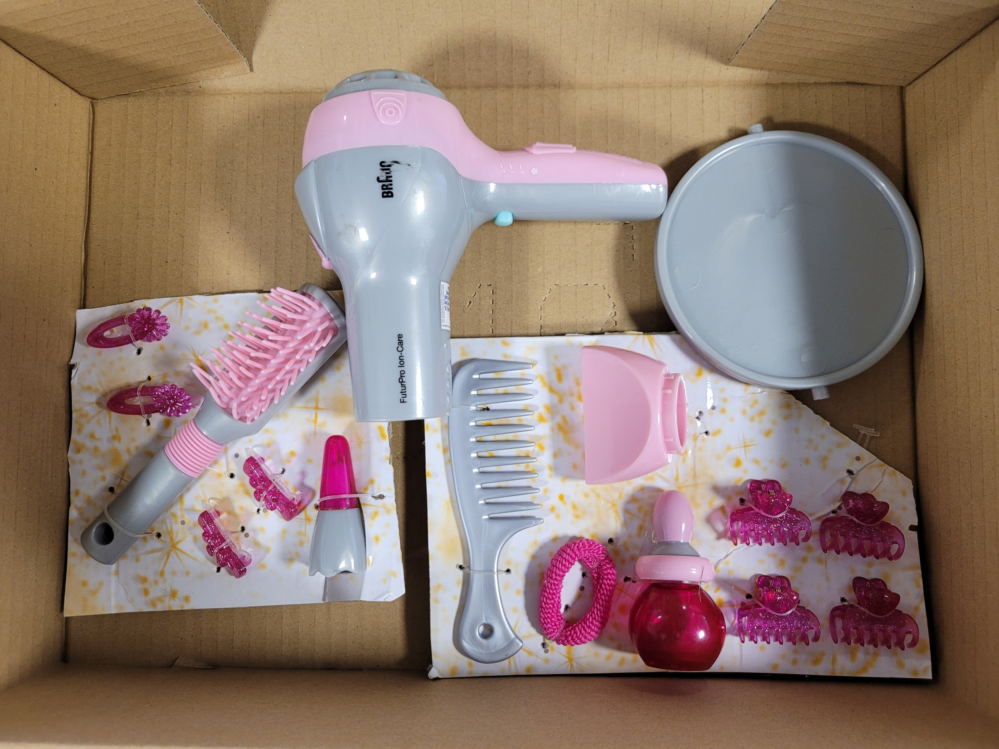 W zestawie znajduje się szaro-różowa suszarka stworzona na wzór modelu FuturePro Iron-Care marki Braun. Suszarka działa na baterie, podczas wciskania przycisku, który znajduje się na rączce suszarki, emituje ona cichy dźwięk działania silniczka oraz dmucha chłodnym strumieniem powietrza, dzięki czemu nie ma ryzyka oparzenia się podczas zabawy. Ponadto w zestawie znajduje się nakładka na końcówkę suszarki, lusterko, szczotka do włosów, grzebień, różowa gumka do włosów, osiem spinek oraz dwie imitacje kosmetyków.