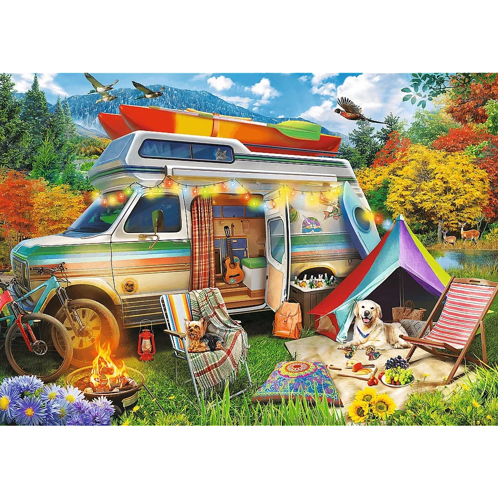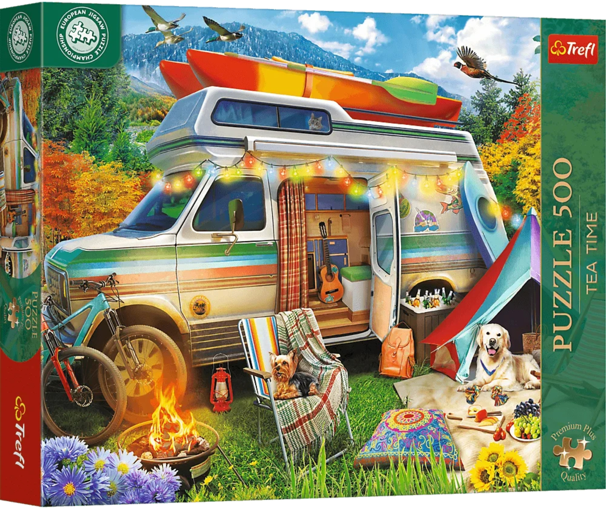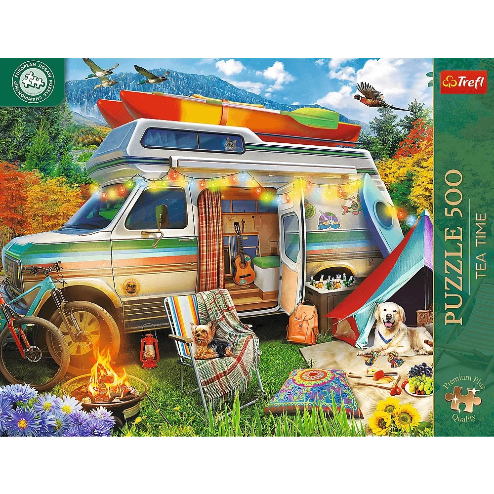 Zestaw puzzli składa się z 500 elementów i umożliwia ułożenie niezwykle barwnego obrazka z kamperem i zwierzętami.