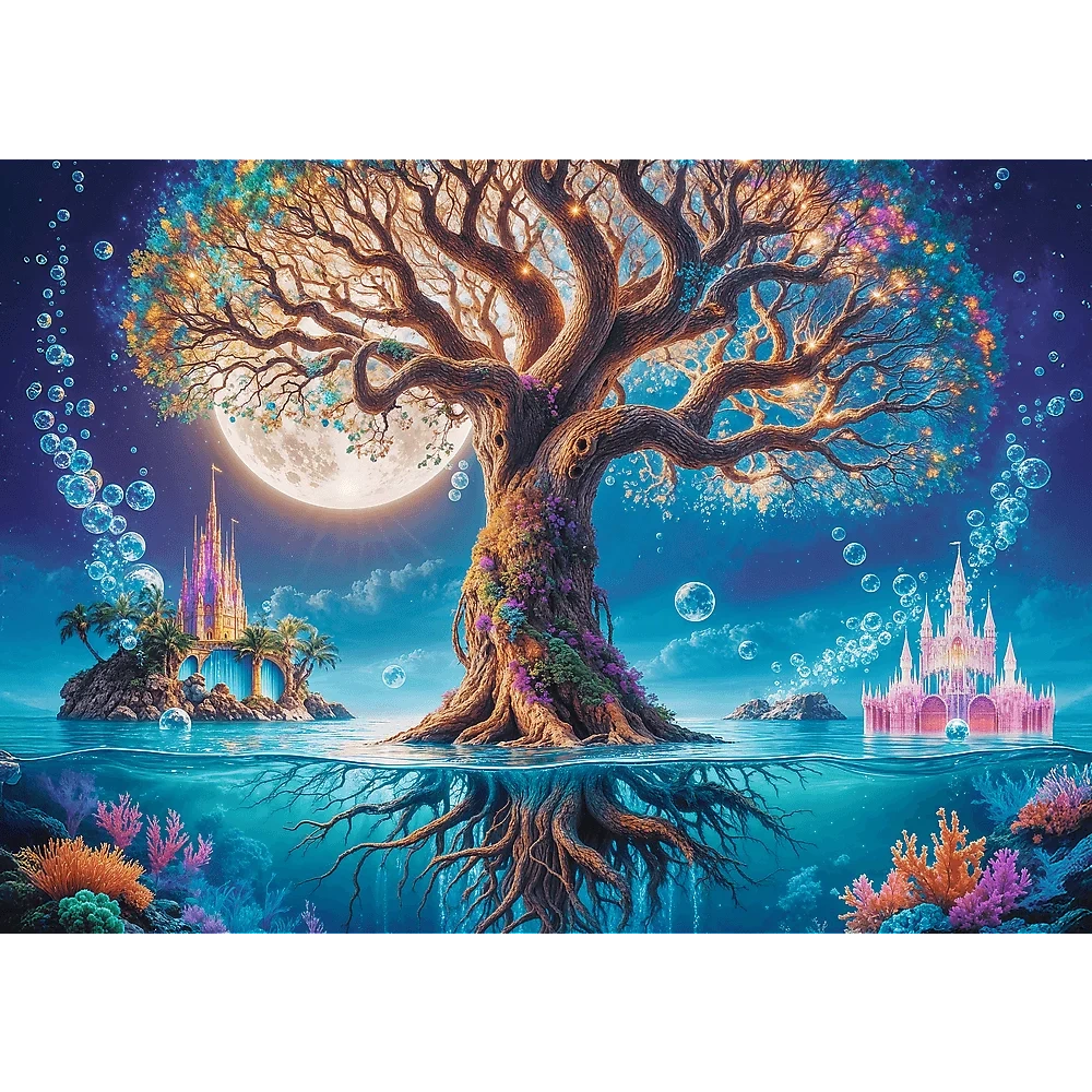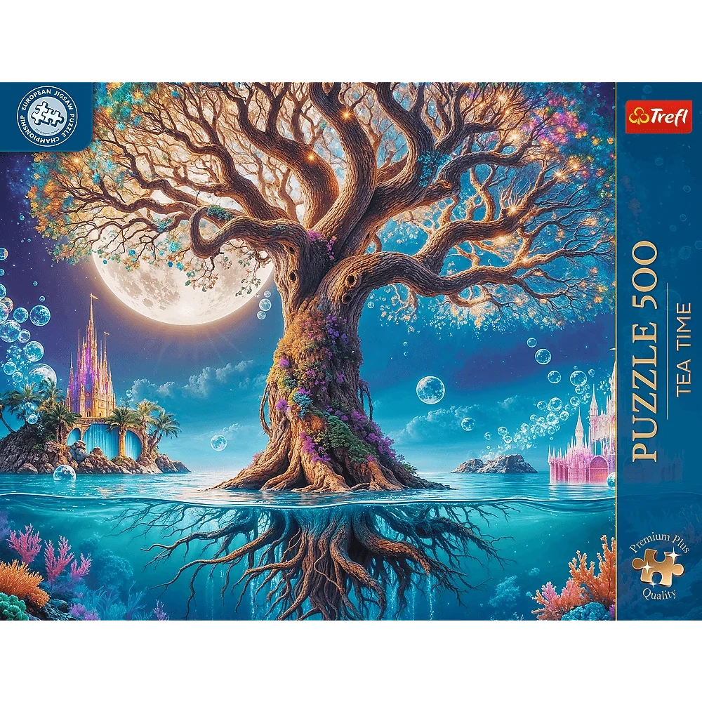 Zestaw puzzli składa się z 500 elementów i umożliwia ułożenie niezwykle barwnego obrazka przedstawiającego magiczne drzewo w bajkowym świecie.