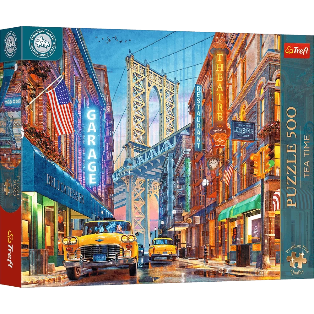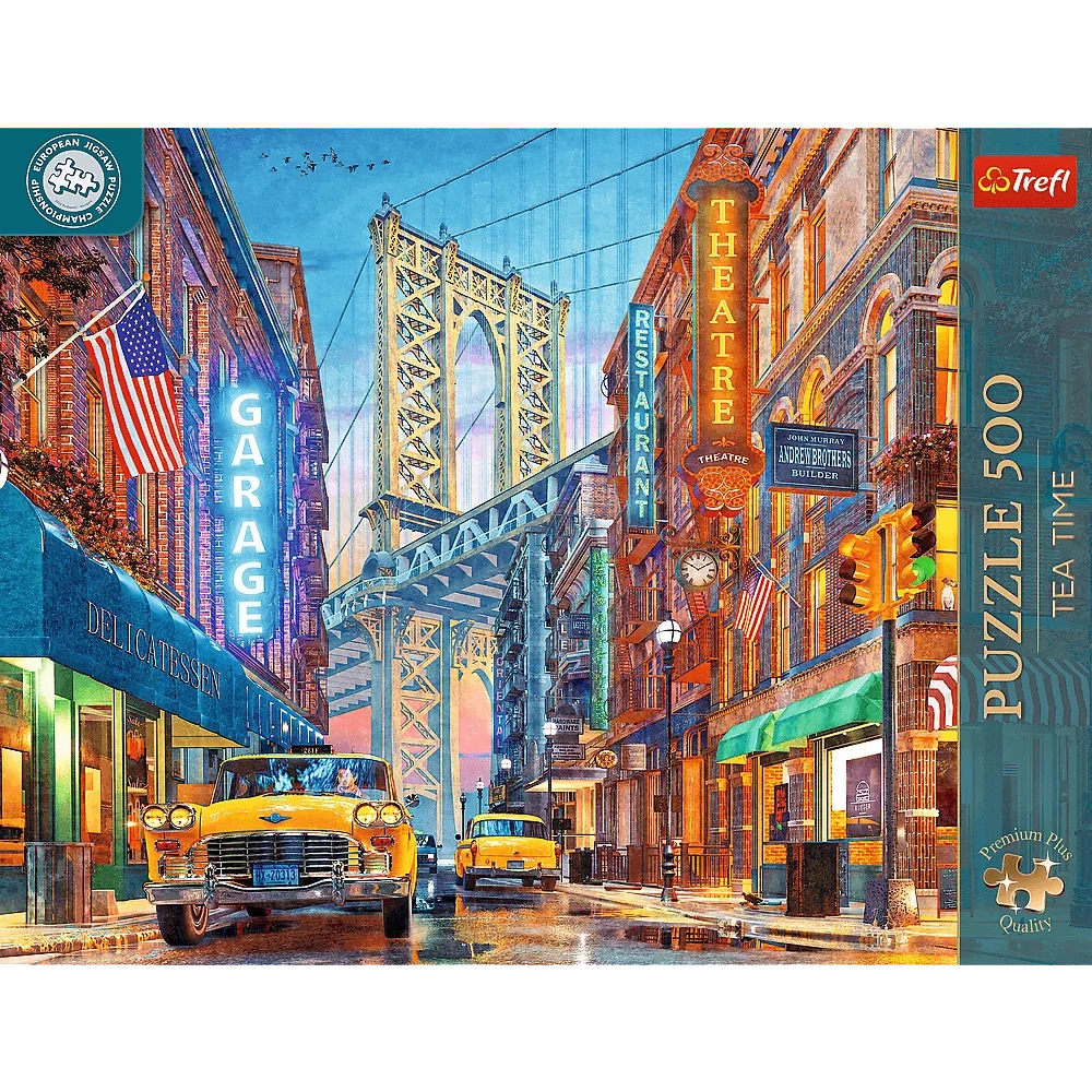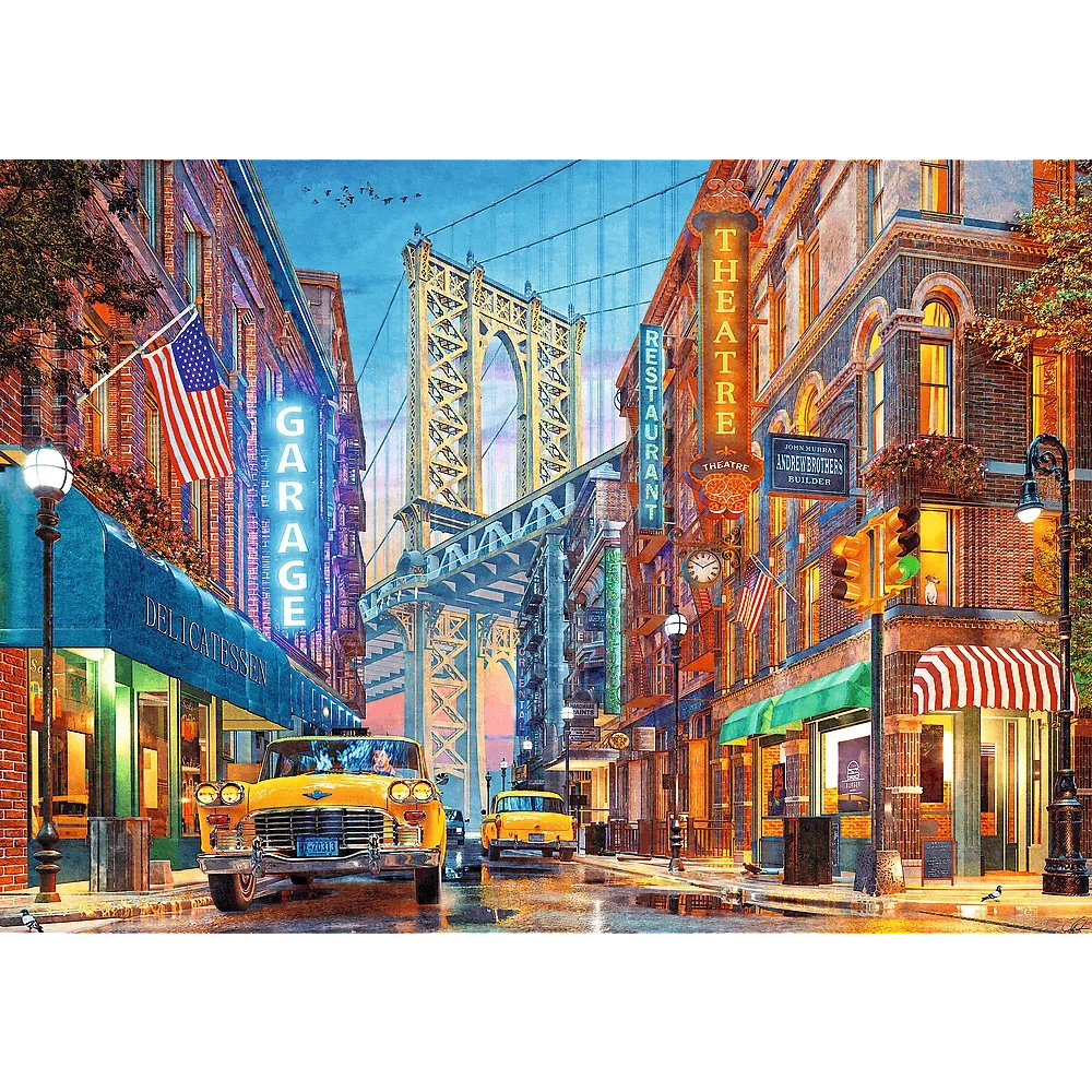 Zestaw puzzli składa się z 500 elementów i umożliwia ułożenie niezwykle barwnego obrazka z widokiem na uliczkę i Manhattan Bridge.