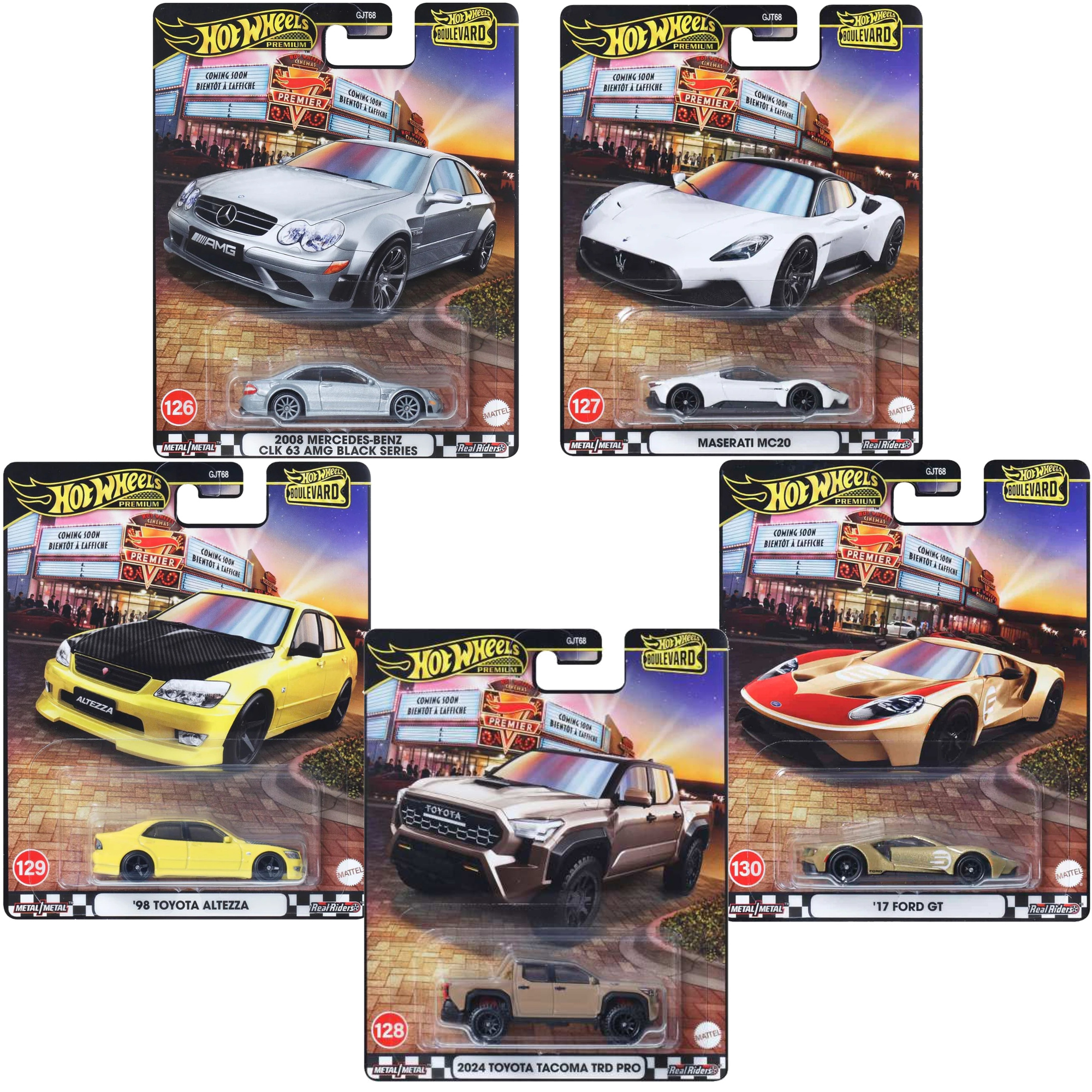 Hot Wheels Premium Boulevard zestaw 5 aut Mercedes-Benz 2008 CLK 63 AMG Black Series, Toyota Altezza, Maserati MC20, Toyota Tacoma TRD PRO, Ford GT 7 cm