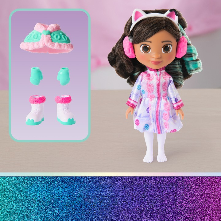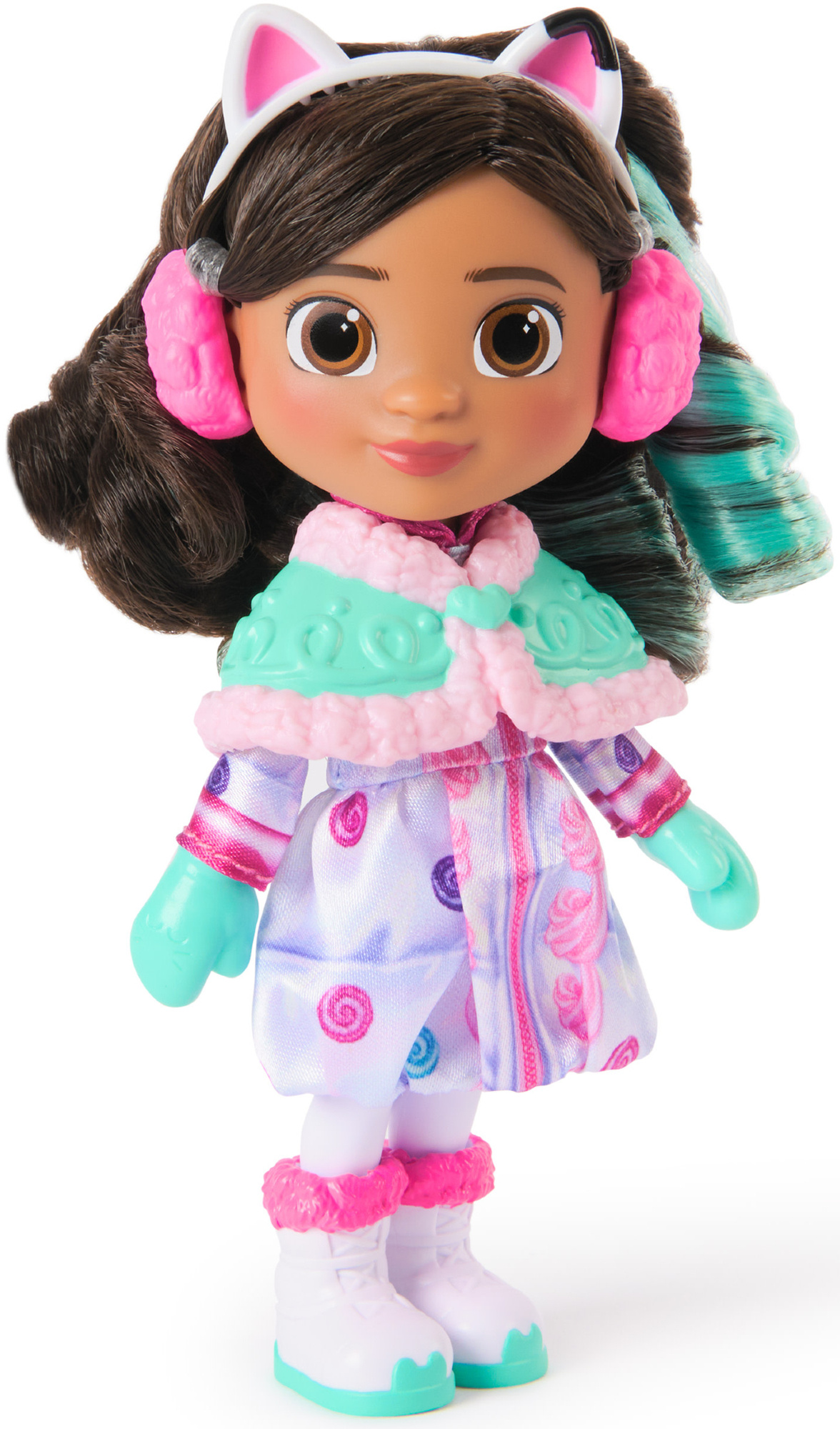 - Lalka ma ciemniejszą karnację, brązowe oczy i brązowe kręcone włosy. Ubrana jest w długą cukierkową kurtkę oraz białe legginsy. Gabi ma ruchome ręce i nogi oraz głowę.