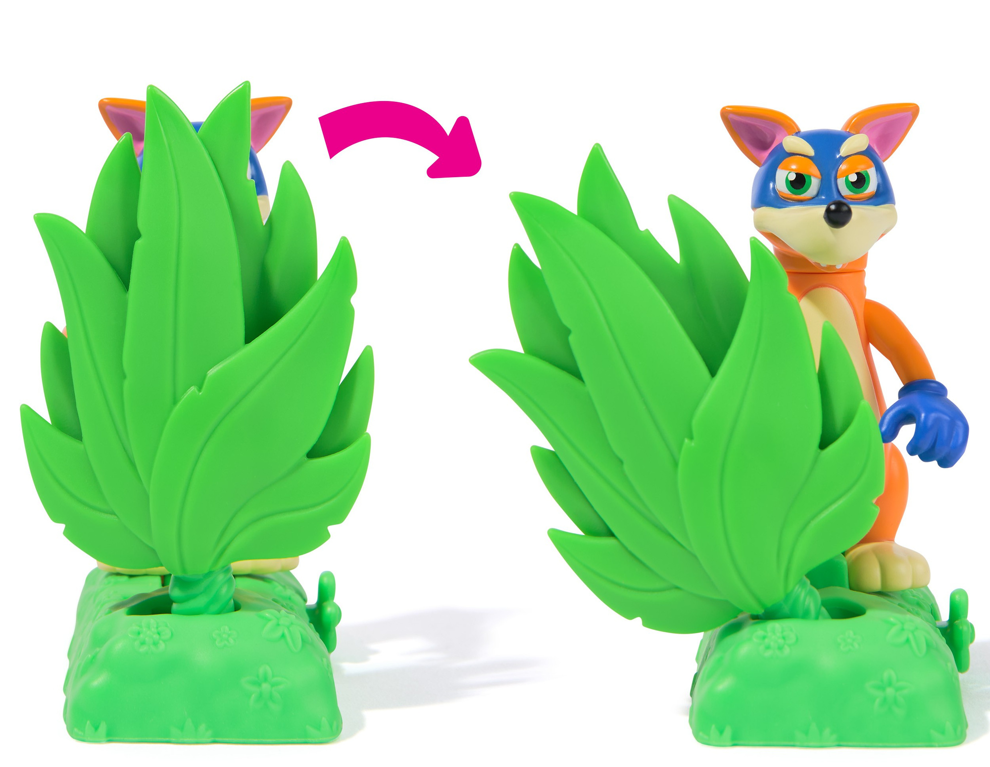 Wraz z figurką małpki, w zestawie znajduje się lisek - Rabuś. Jest on w pomarańczowym kolorze. Ubrany w rękawiczki oraz granatową maskę. W zestawie znajduje się również kolorowy prezencik oraz ruchome liście, za którymi czai się sprytny lisek.