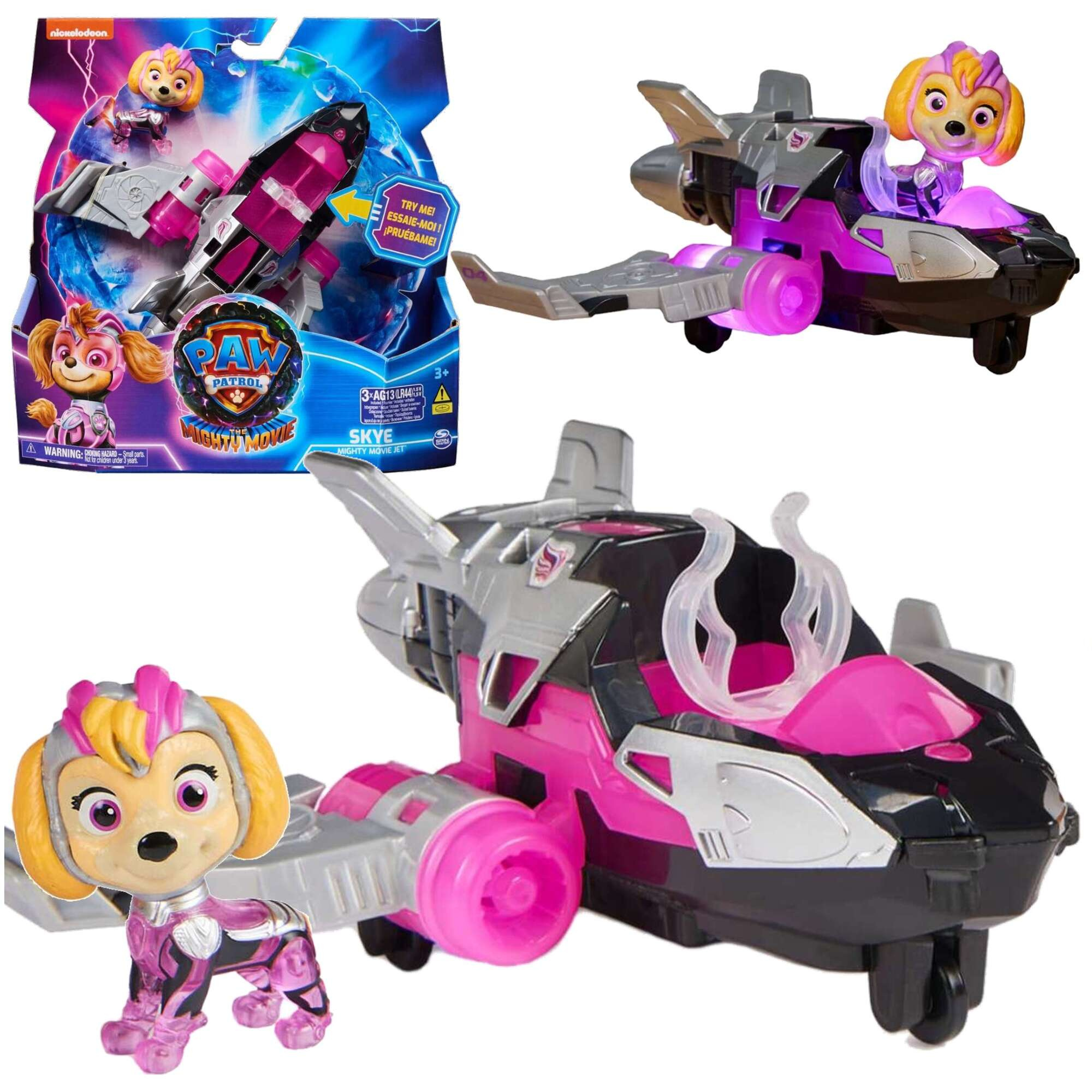 Psi Patrol The Mighty Movie Wielki Film Zestaw figurka Skye różowy odrzutowiec pojazd dźwięk światło + GRATIS maskotka Chase 17 cm