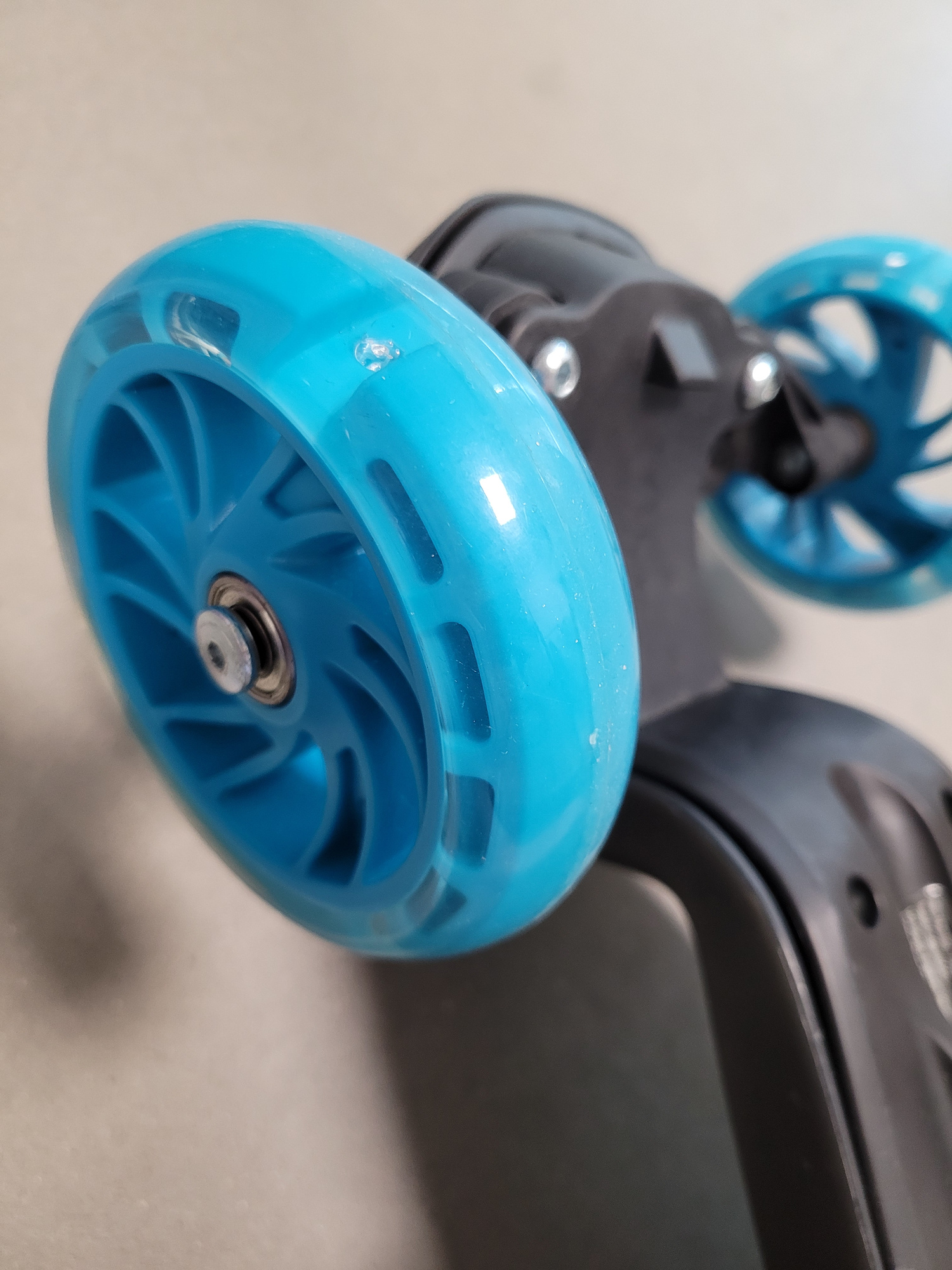 Przednie koła są większe niż tylne, dzięki temu hulajnoga zachowuje stabilność podczas poruszania się. Wewnątrz wszystkich trzech znajdują się łożyska typu ABEC-5, zapewniające cichą jazdę rekreacyjną.