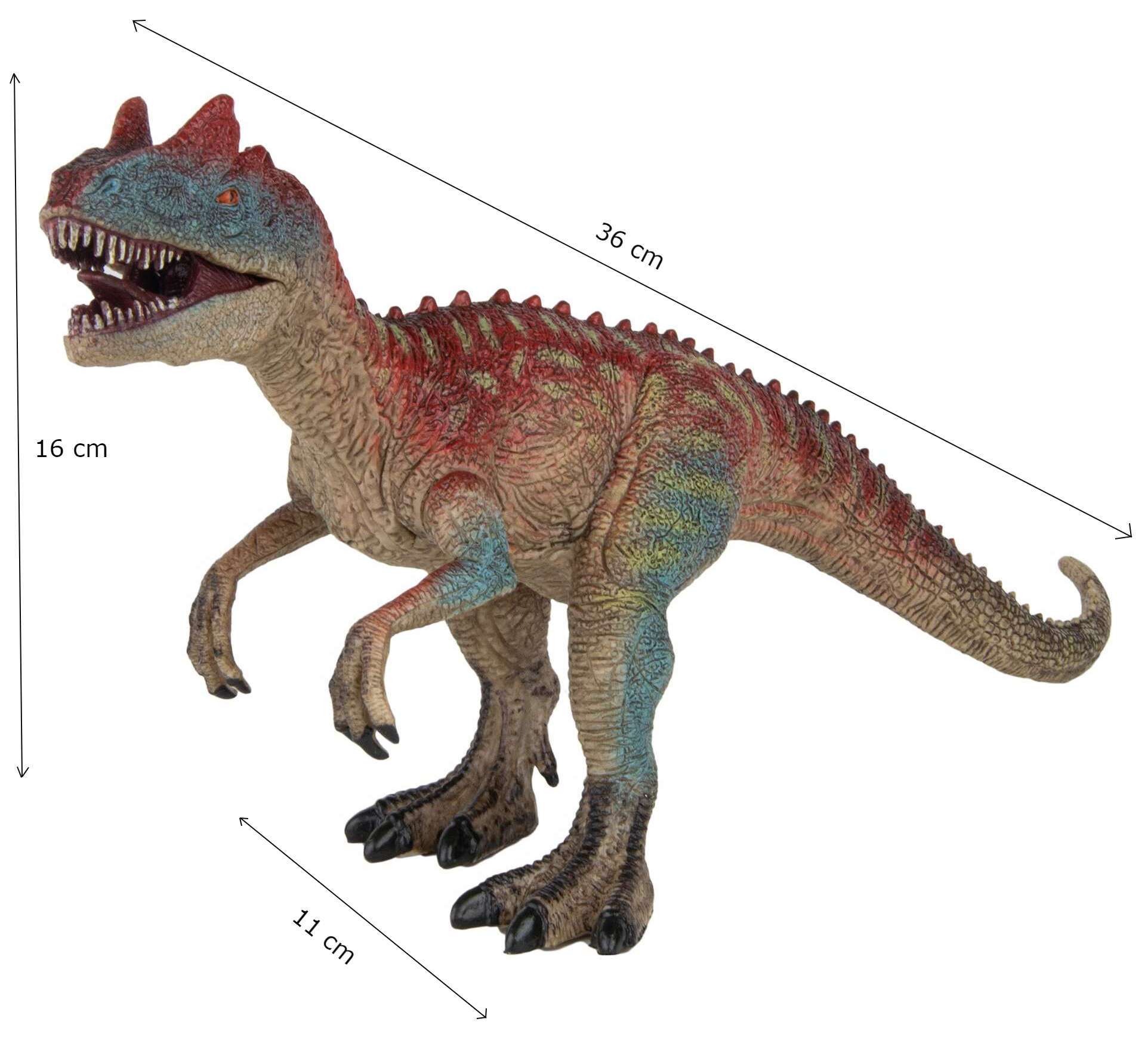 Allosaurus – długość ok. 31 cm, wysokość 16 cm, ruchome łapy i paszcza, beżowo-czerwono-niebieskie wykończenie.