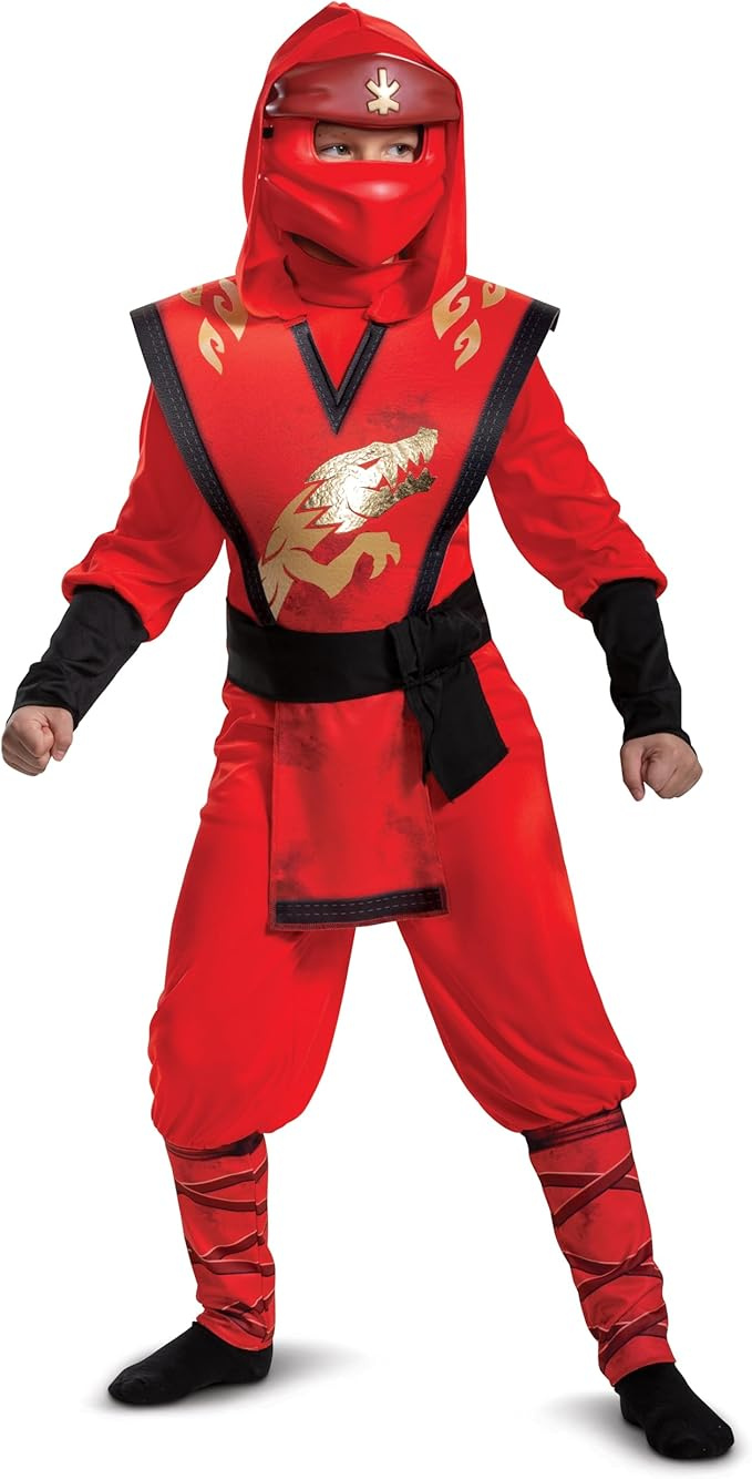 - Zawiera czerwony kostium oraz maskę, dzięki czemu dziecko może upodobnić się do czerwonego ninja o imieniu Kai. Przebranie jest przeznaczone dla dzieci w wieku 7-8 lat, o wzroście od 127 do 136 cm.