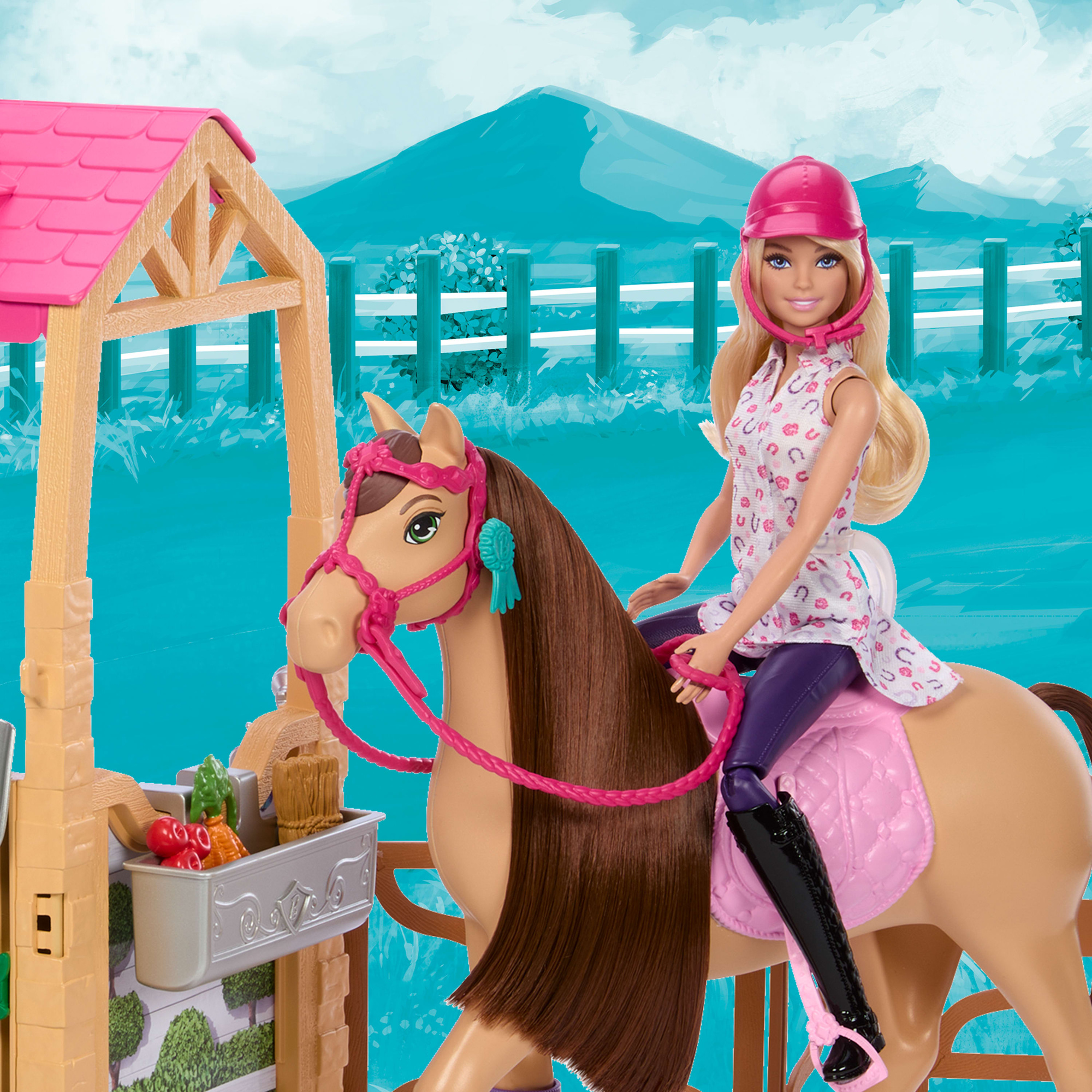 Lalka Barbie ma ruchome kolana, dzięki czemu zabawa w jazdę konną staje się jeszcze bardziej realistyczna. Koń zachwyca długą, miękką grzywą i ogonem, które można czesać i stylizować według własnego pomysłu.