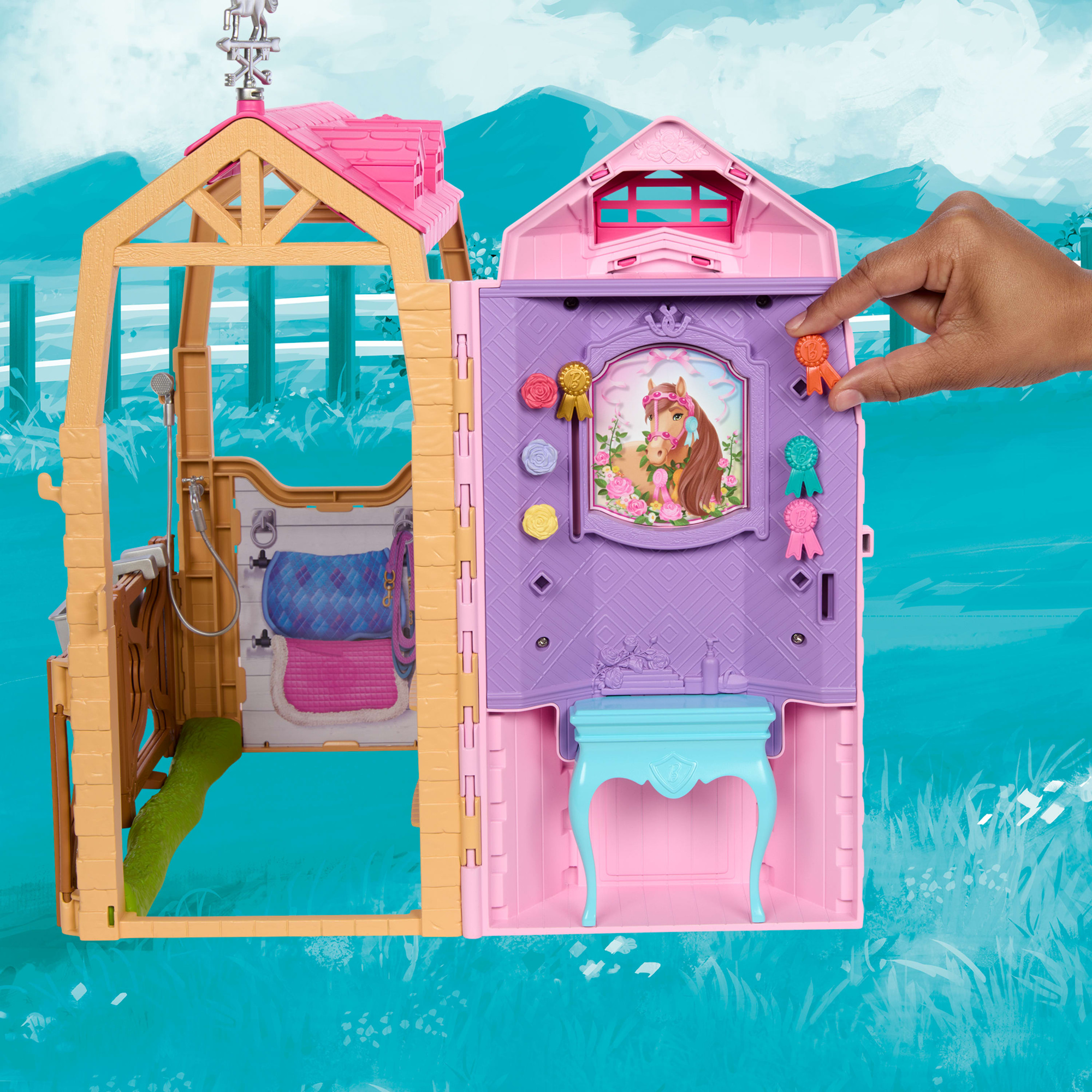 W zestawie czeka aż 6 stref zabawy. Na stanowisku do karmienia Barbie może podawać swojemu konikowi kolorowe „warzywa”, w obszarze pielęgnacyjnym wyszczotkować jego miękką grzywę i ogon, a przy płotku trenować efektowne skoki. Na ścianie zwycięzców zawiesisz wstążeczki lub zdjęcia, a w ogródku pełnym róż stworzysz bajkowy klimat. Do dyspozycji są również akcesoria do porządków w stajni, takie jak grabie, łopata czy siano.