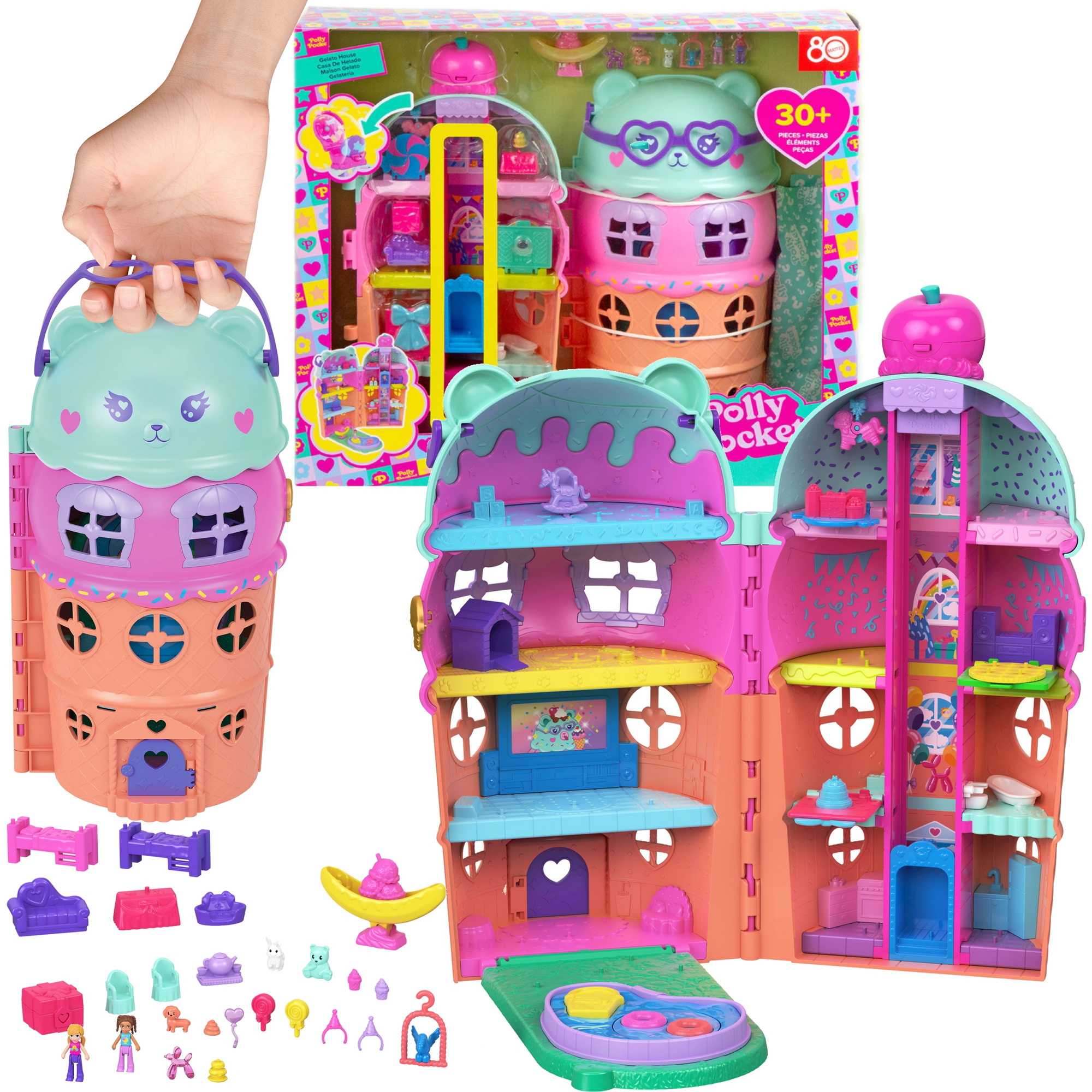 - Polly Pocket Lodowy deser to domek do zabawy który kształt kolorowego lodowego rożka z uroczym misiem. Domek można przenosić i bawić się nim w dowolnym miejscu. Zestaw zawiera dwie mikrolalki, figurki zwierzątek i ponad 25 akcesoriów.