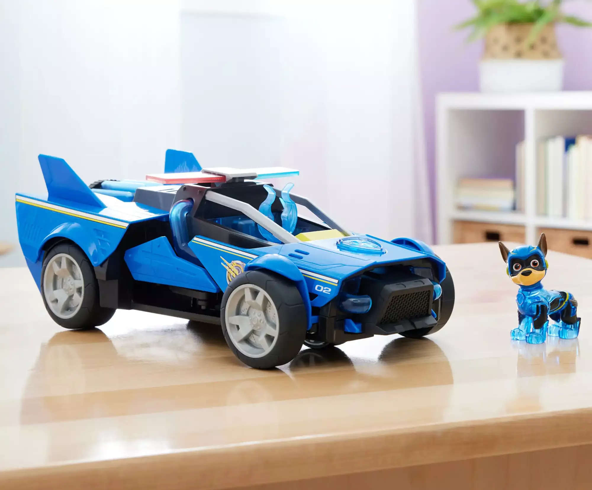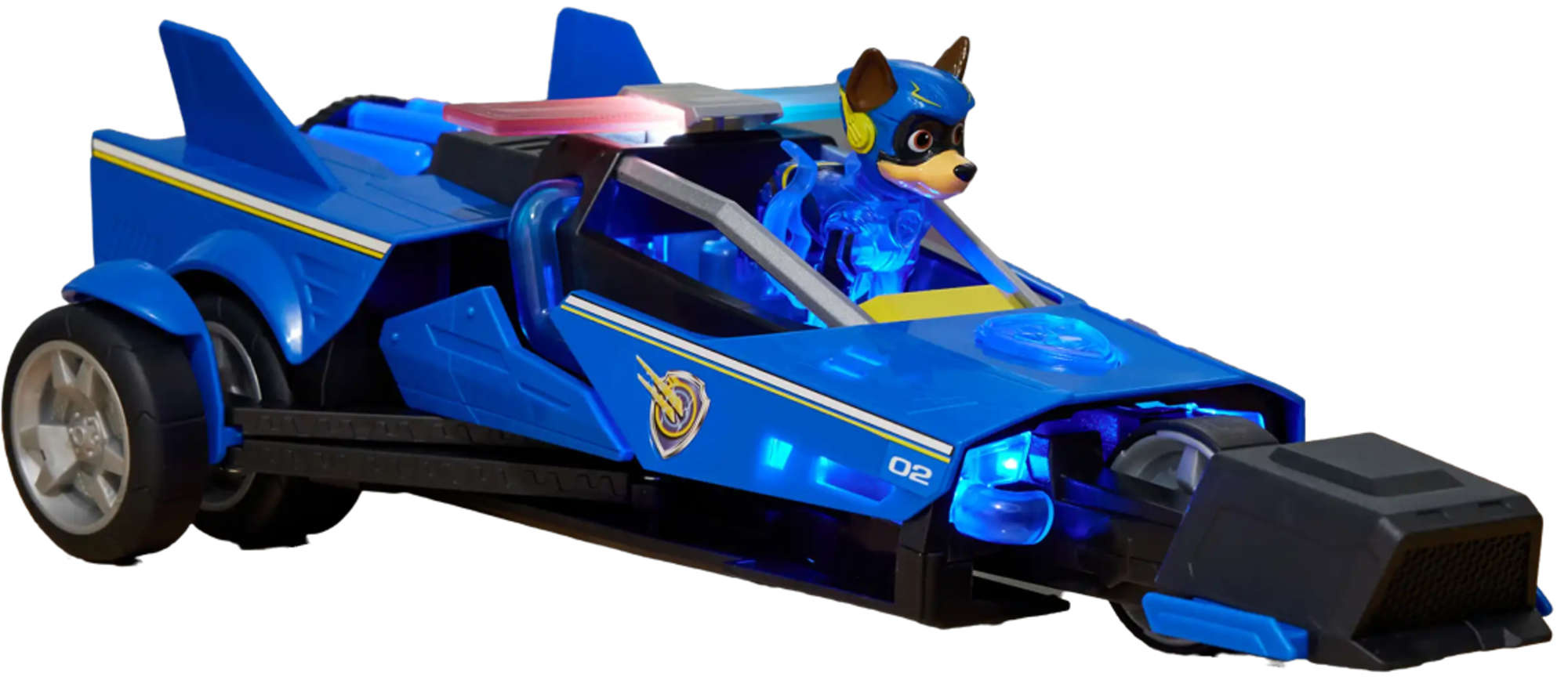 Wraz z pieskiem, w zestawie, znajduje się pojazd - krążownik. Posiada czarno-niebieską karoserię z żółtymi elementami. Po bokach samochodu widać dodatkowe, ruchome koła, które wysuwają się i dodają prędkości podczas jazdy. W autku znajduje się miejsce dla figurki. Po włożeniu jej na miejscu kierowcy i naciśnięciu, można usłyszeć efekty dźwiękowe oraz najmłodsi zobaczą świecące elementy na pojeździe.