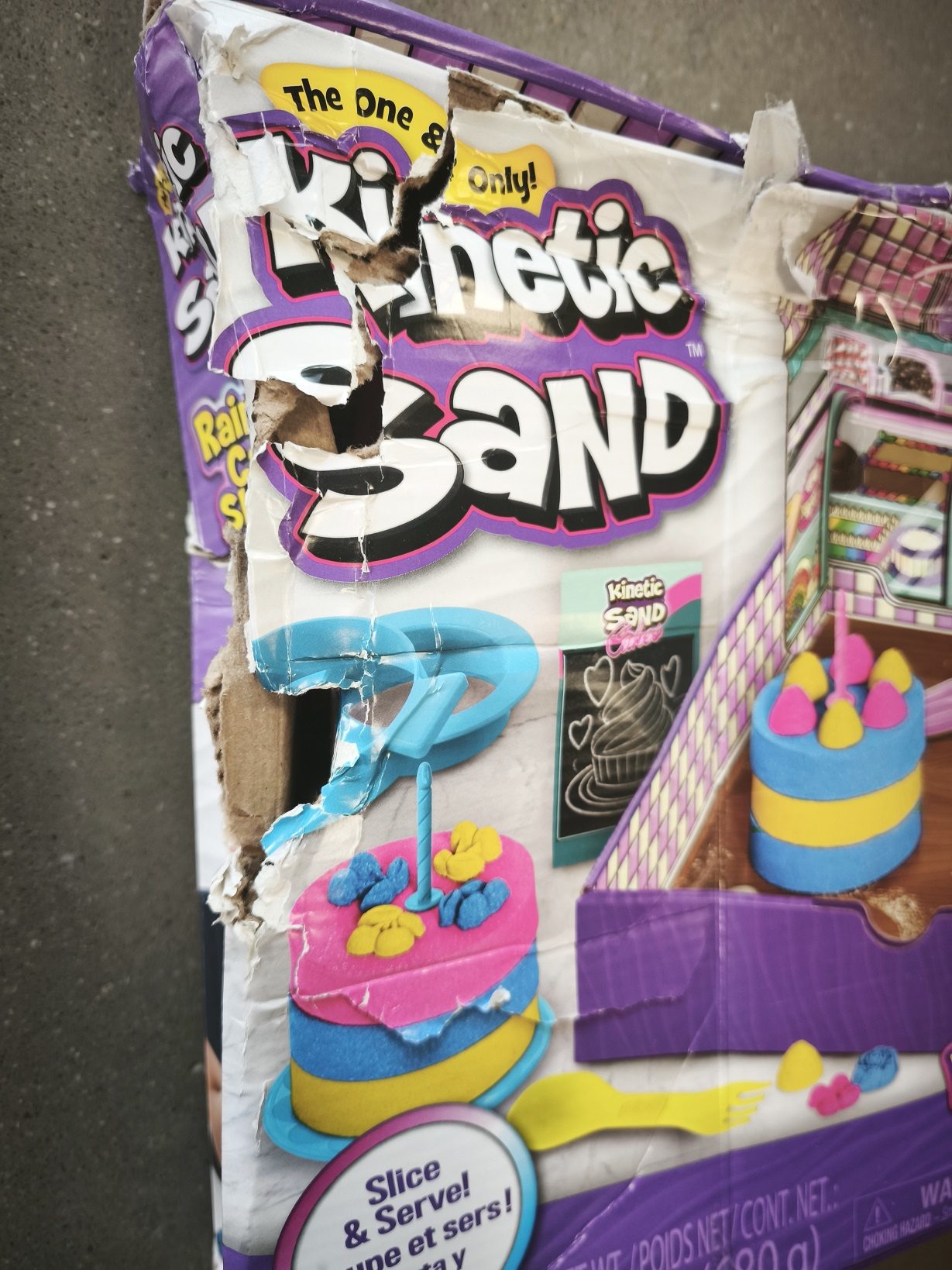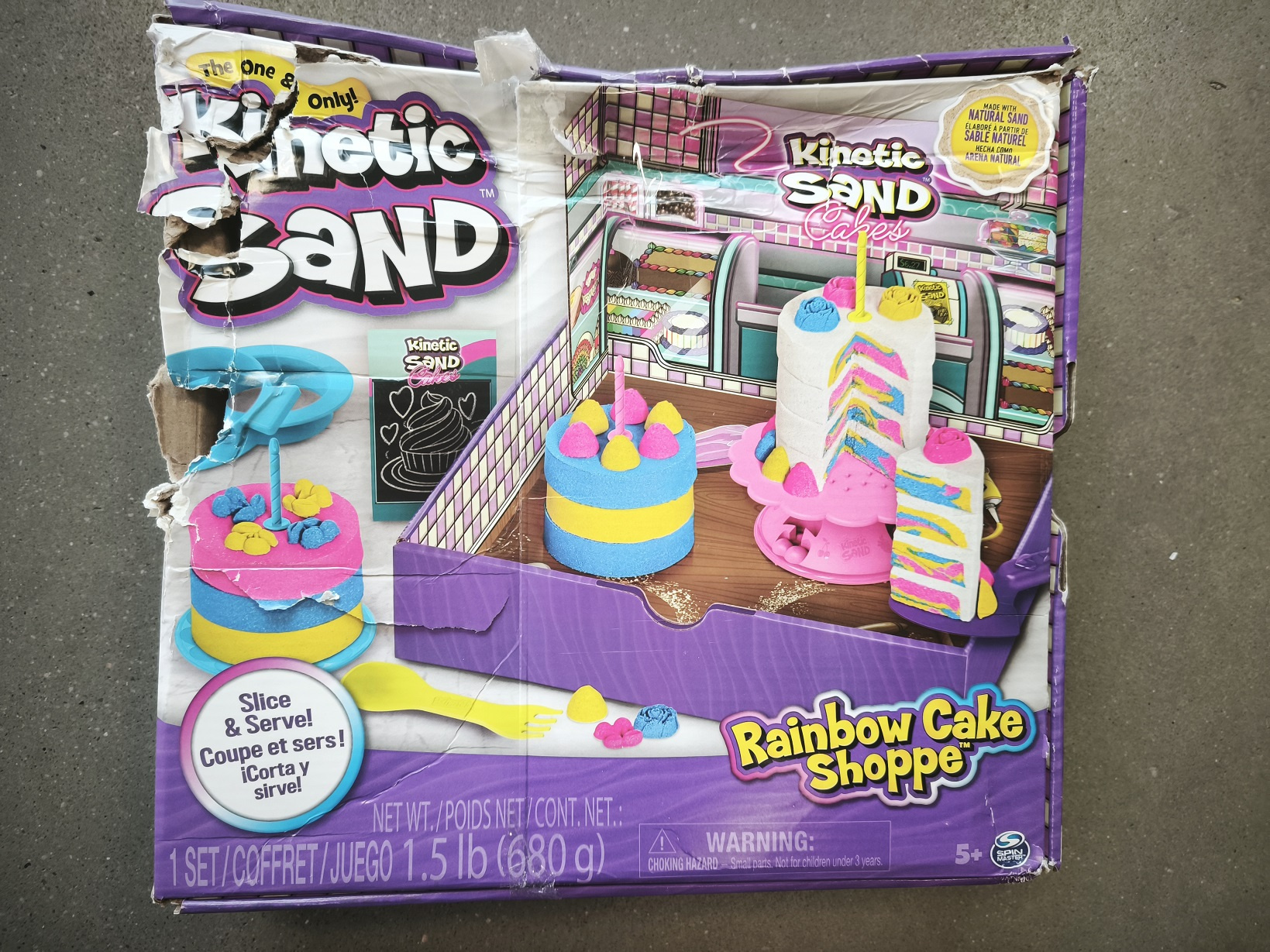 - Kinetic Sand Rainbow Cake Shoppe to zestaw inspirowany pieczeniem tortów i ciast. W pudełku znajdziemy 680 g kolorowego piasku w kolorze żółtym, różowym, niebieskim i białym o zapachu wanilii. Dzieci mogą tworzyć kolorowe, warstwowe wypieki.