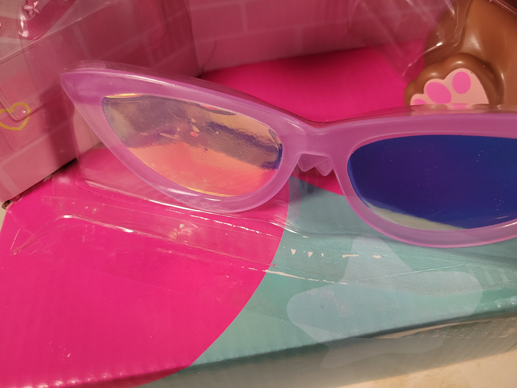 - akcesoria (grzebyk, 6 x gumka do włosów, naszyjnik, okulary przeciwsłoneczne, 3 x pasemka do przedłużania, kolorowy proszek, błyszcząca butelka, szablon do ozdabiania, 2 x klips do włosów, 8 ozdób do włosów, arkusz z naklejkami / klejnotami, opakowanie brokatowe, akcesorium do stylizacji, opakowanie schowane we włosach - kulka).