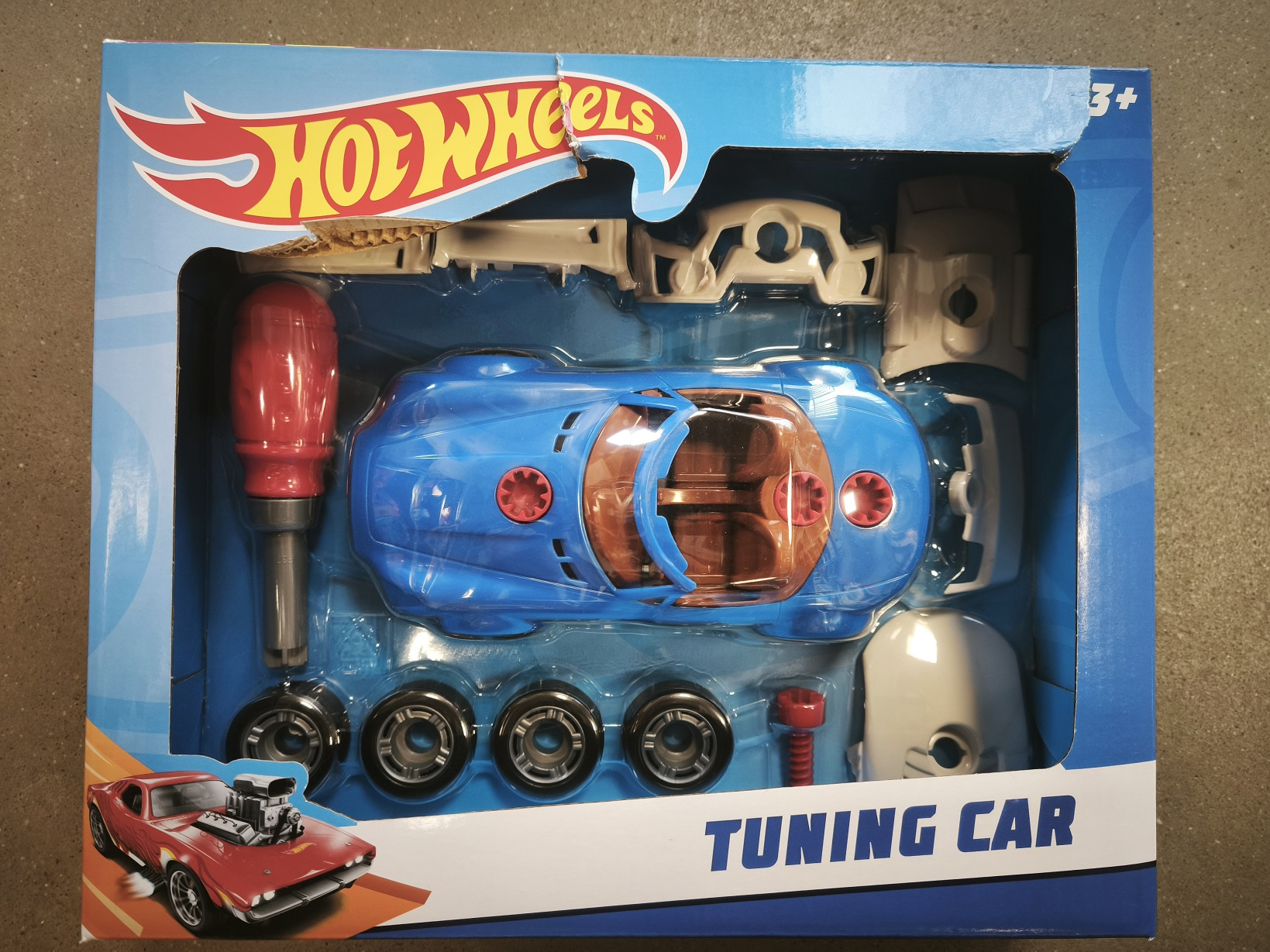 - Zestaw do skręcania marki Klein na licencji Hot Wheels, w którego skład wchodzi niebieskie auto typu kabriolet z elementami do przemiany w wyścigówkę, śruby mocujące, kolorowe naklejki i śrubokręt.