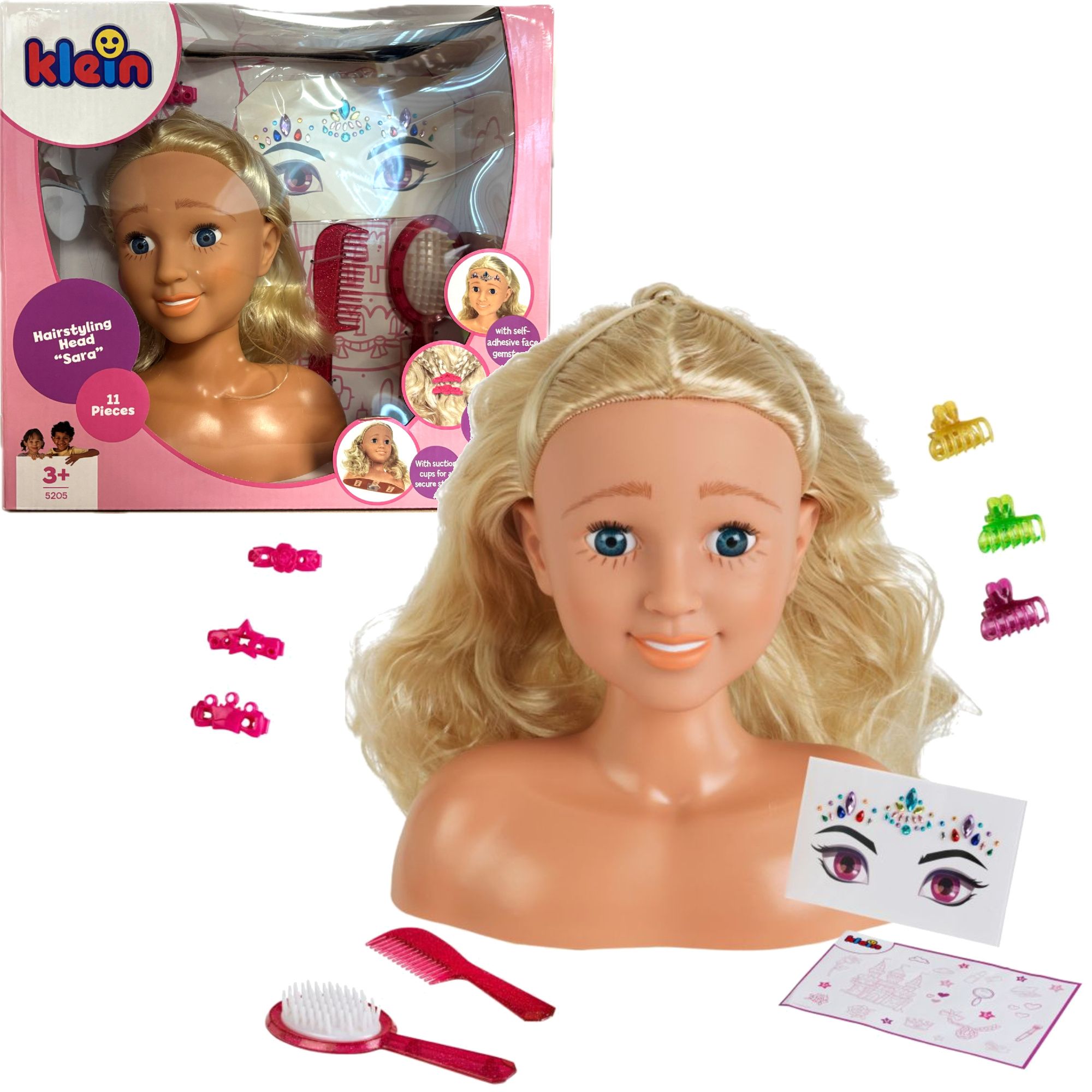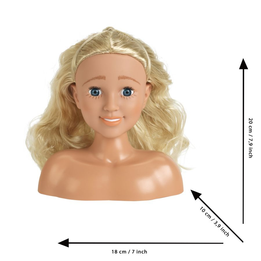 - W zestawie z głową znajdują się akcesoria do włosów (szczotka, grzebyk oraz spinki). Dołączone do zestawu dodatki pozwolą każdej małej stylistce na stworzenie wielu różnych fryzur, jedynym ograniczeniem tutaj, jest wyobraźnia dziecka.