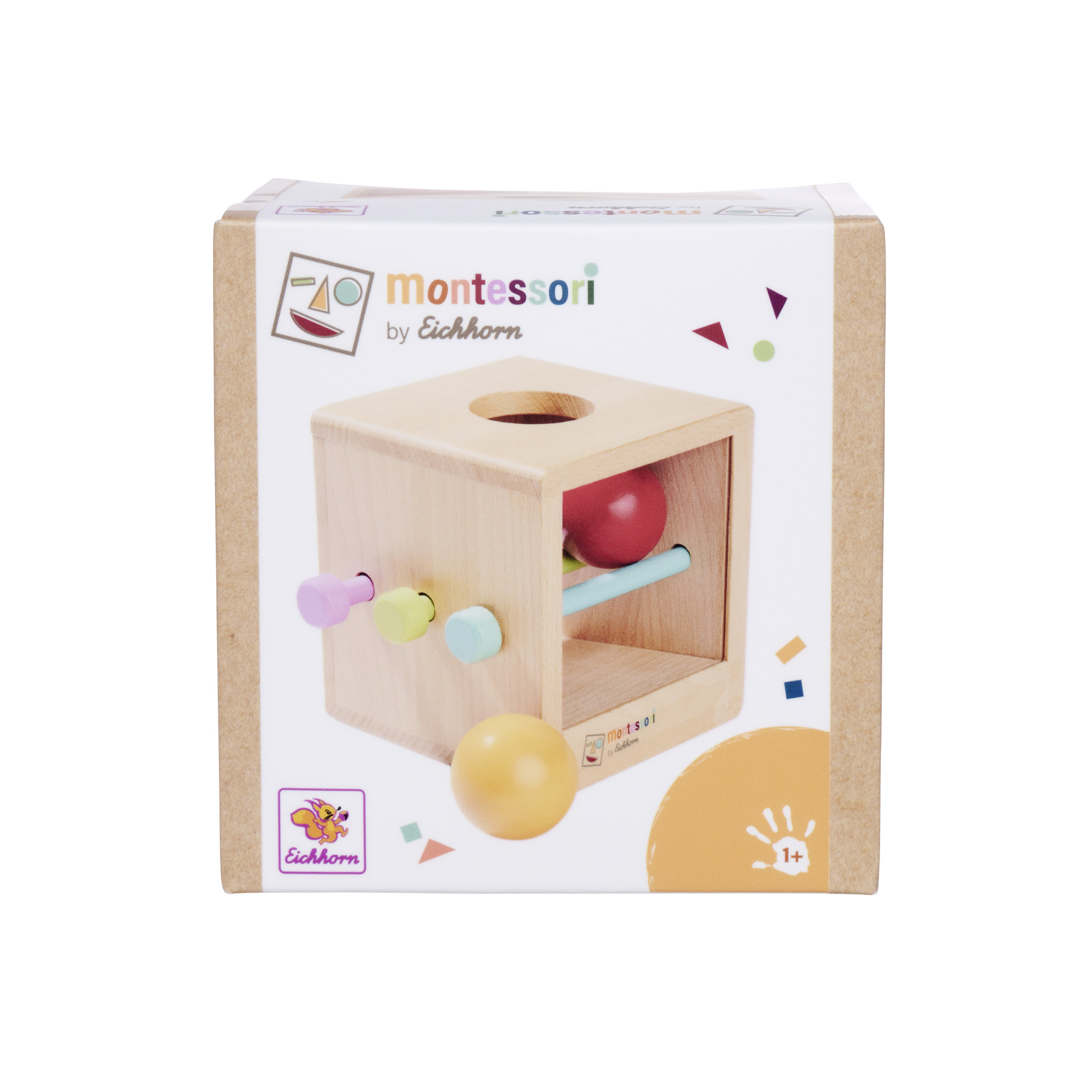 Do dużej kostki przyczepiamy patyczki, wkładając je w otwory po boku. Następnie wrzucamy jedną kulkę do środka. Powinna się ona zatrzymać na patyczkach. Podczas zabawy dziecko może dowolnie wyciągać i wkładać patyczki oraz wrzucać obie kulki.