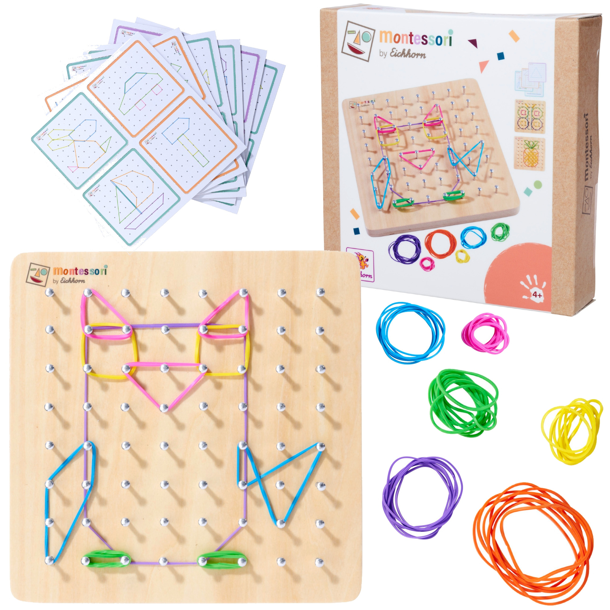 Montessori Zestaw Drewniana Plansza Gumki + Wzory Tablica Geometryczna 85 Elementów