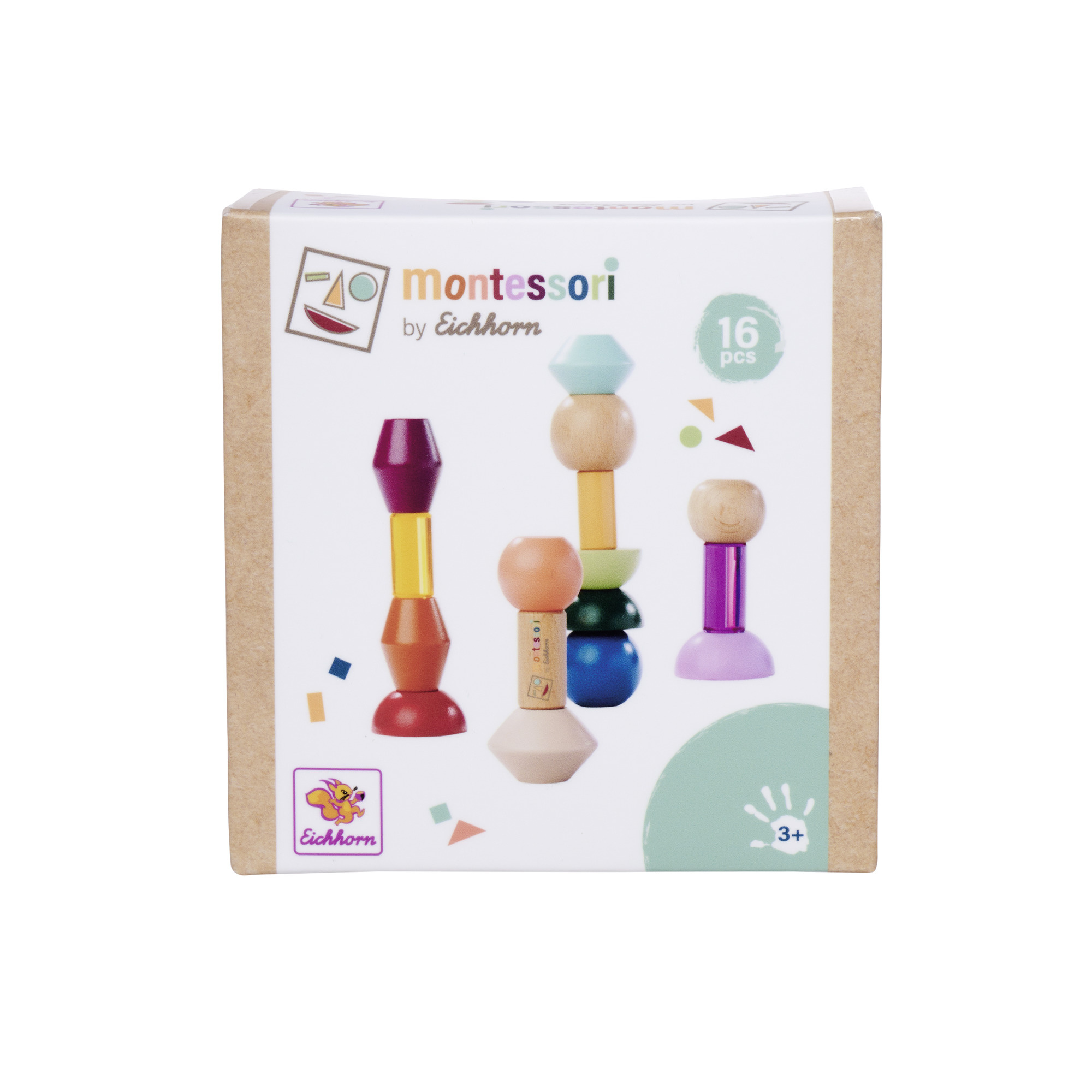 Montessori Drewniane Wieże z Kształtów 16 Kolorowych Elementów