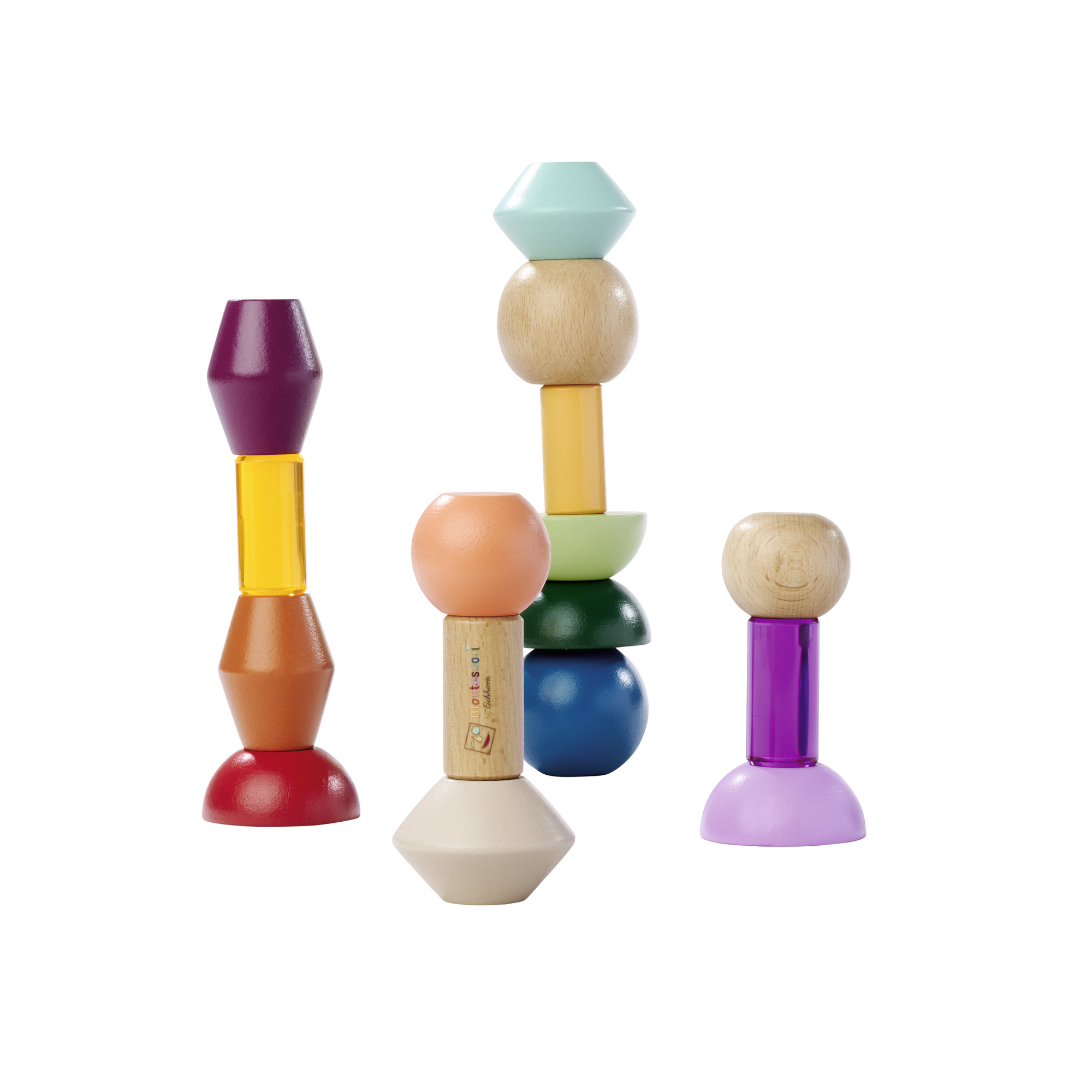 Drewniana układanka składa się z 16 kolorowych elementów, z których można ułożyć niezwykle wysoką wieżę bądź kilka mniejszych. Każdy z części posiada płaskie fragmenty, aby układanie stało się jeszcze prostsze.