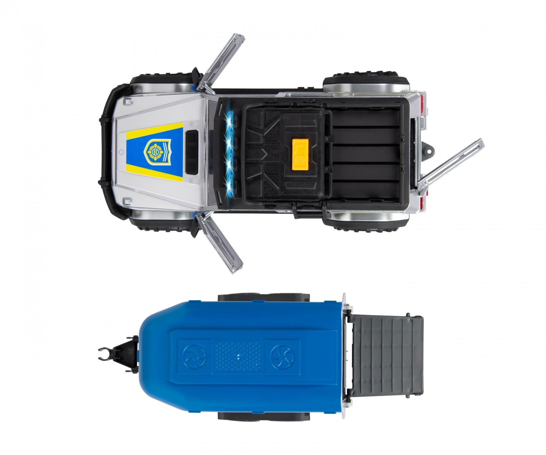 - Zestaw składa się z radiowozu, przyczepki oraz figurek konia i policjanta. Pojazd posiada efekty świetlne i dźwiękowe. Długość pojazdu: ok. 23 cm, długość przyczepki: 13 cm. Wymiary opakowania: 42 x 13 x 17 cm.