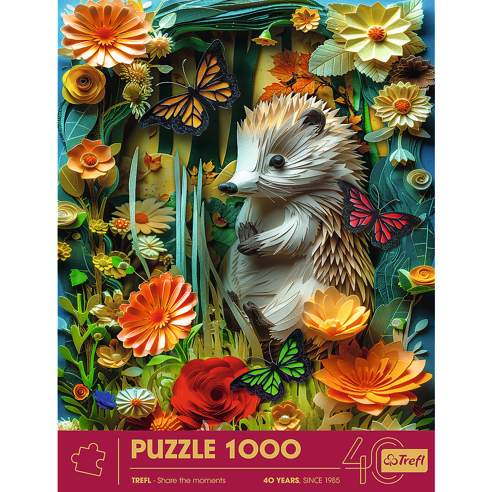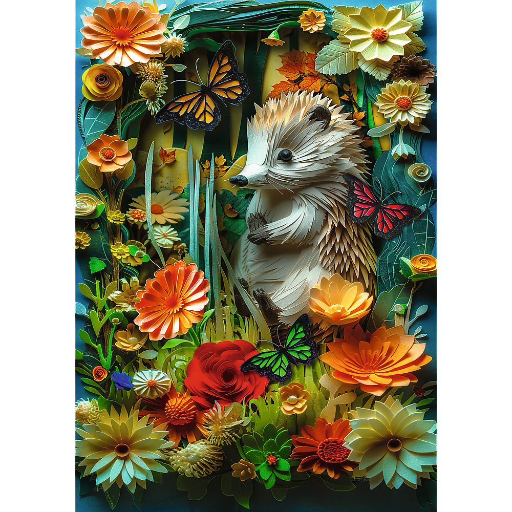 - Zestaw składa się z 1000 elementów i umożliwia stworzenie przepięknego obrazka przedstawiającego obrazek z efektem 3D z uroczym jeżem oraz motylami i kwiatami.