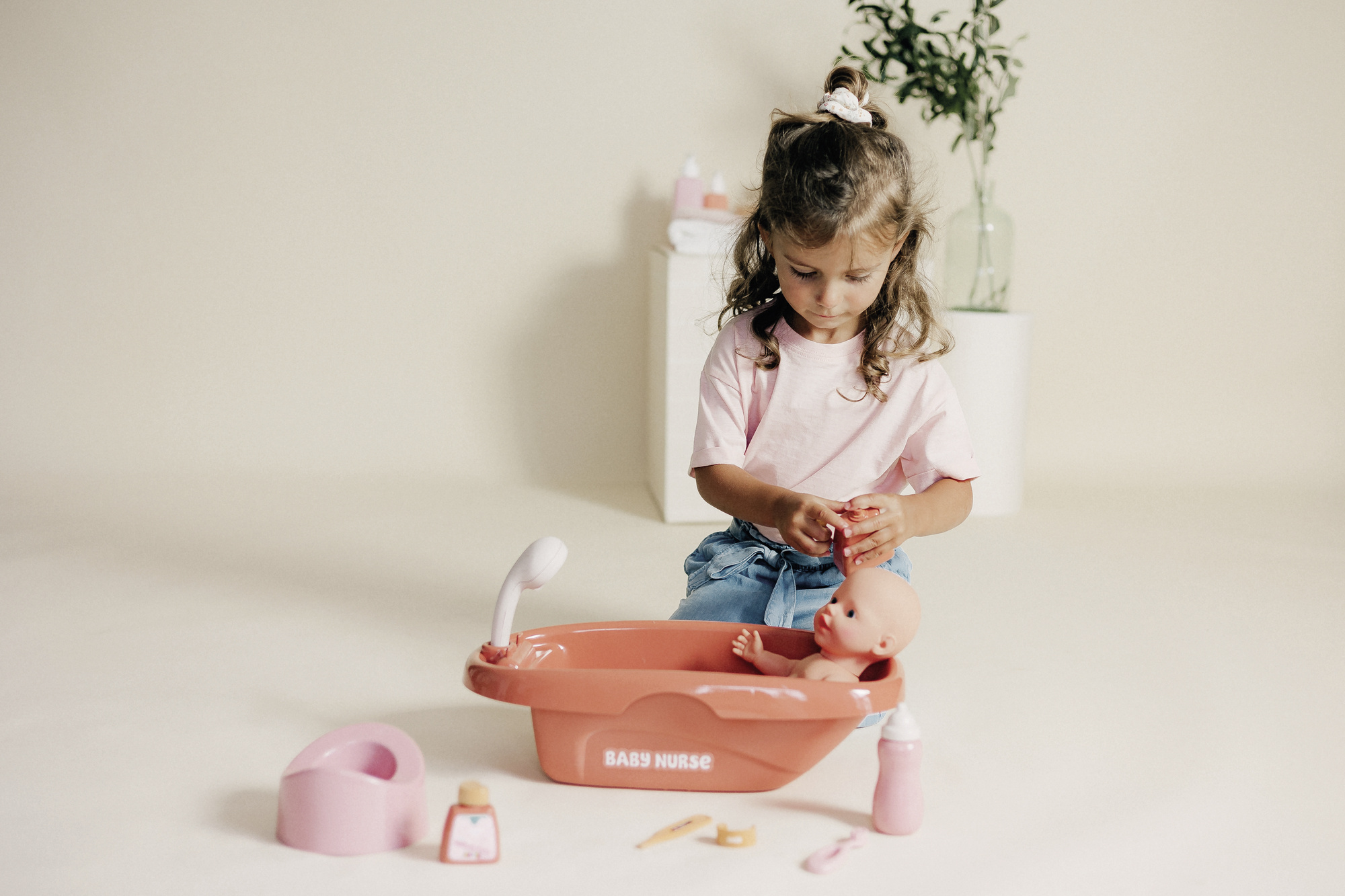Odpinana słuchawka prysznicowa z mechaniczną funkcją obracania sprawia, że mycie włosów lalki staje się jeszcze bardziej realistyczne. Po kąpieli dziecko może nakarmić lalę butelką, a następnie zadbać o jej codzienną pielęgnację - w zestawie znajdują się akcesoria takie jak szczoteczka do zębów, termometr czy nocnik.