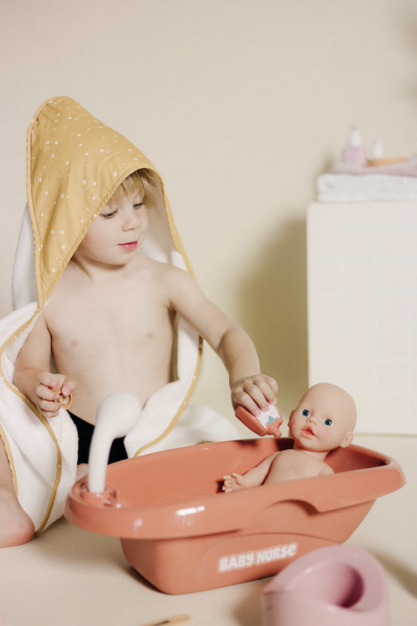 - Po kąpieli dziecko może nakarmić lalę butelką, a następnie zadbać o jej codzienną pielęgnację - w zestawie znajdują się akcesoria takie jak szczoteczka do zębów, termometr czy noc