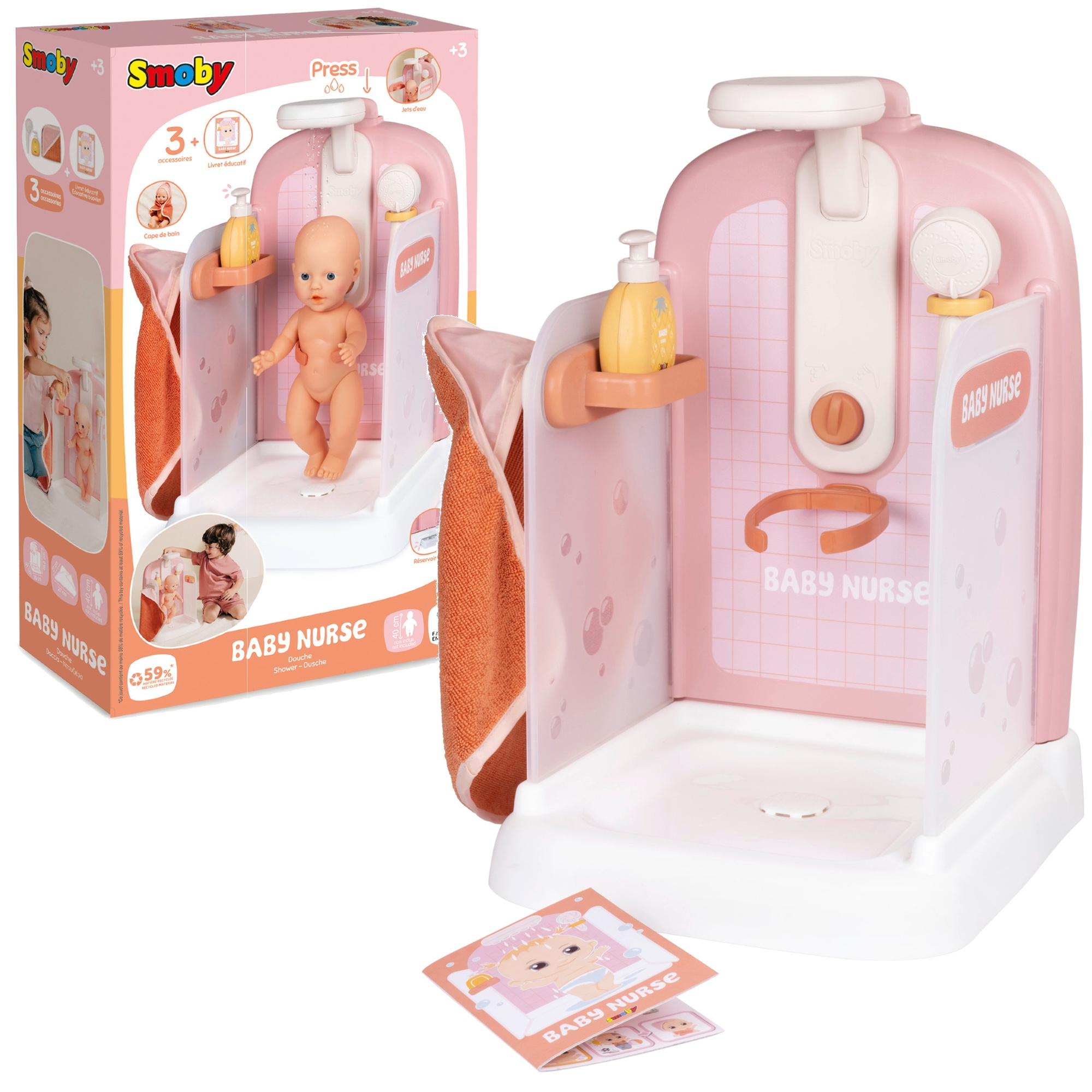 - Baby Nurse Prysznic dla lalek max 40 cm. Z prysznica wypływa woda po naciśnięciu przycisku. Posiada 3 akcesoria ręcznik, płyn do kąpieli i słuchawkę prysznicową. Nie wymaga baterii.